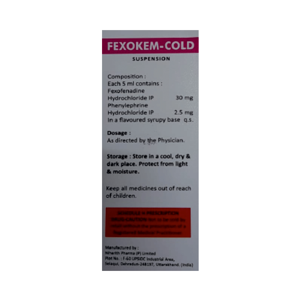Fexokem Cold Syrup is a combination of two medicines: Fexofenadine and Phenylephrine, which relieves sneezing and runny nose caused due to allergies.