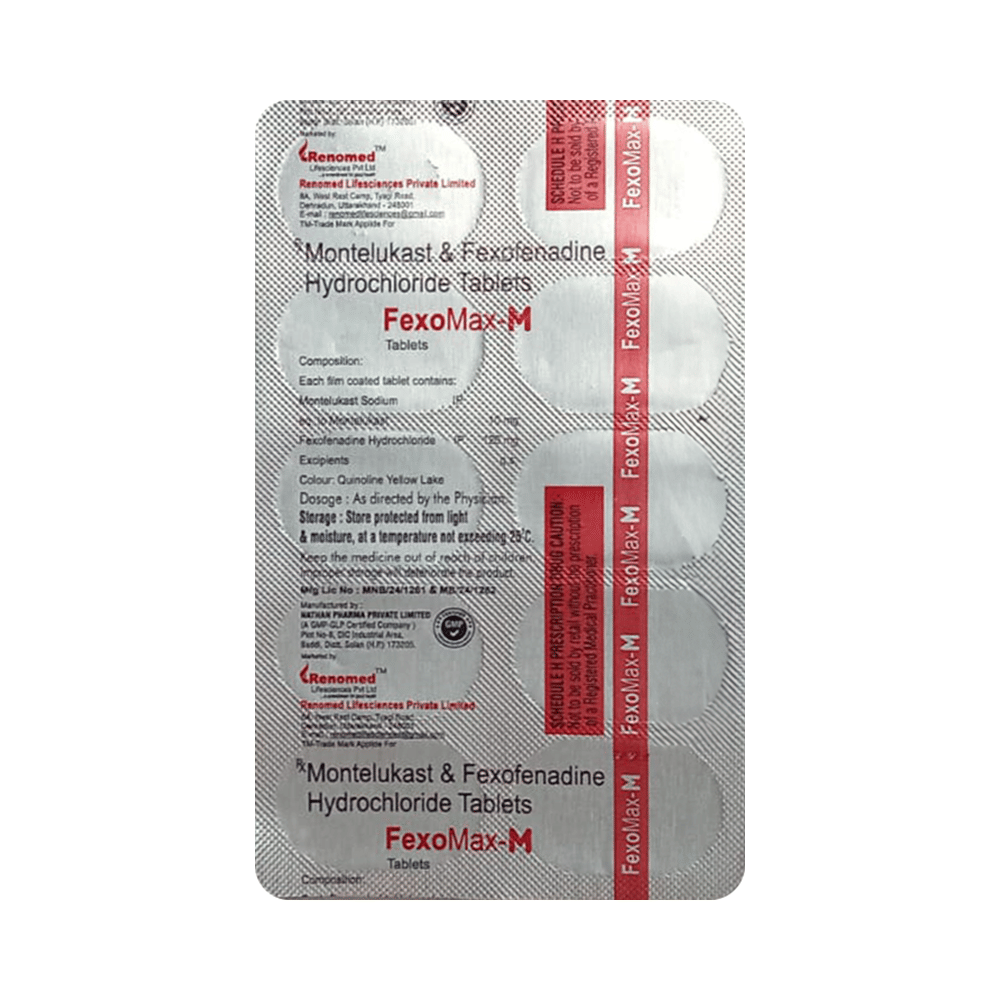 Fexomax-M Tablet is a combination medicine used in the treatment of allergy symptoms such as runny nose, stuffy nose, sneezing, watery eyes, and congestion or stuffiness. Fexomax-M Tablet is taken with or without food in a dose and duration as advised by the doctor. The dose you are given will depend on your condition and how you respond to the medicine. You should keep taking this medicine for as long as your doctor recommends. If you stop treatment too early your symptoms may come back and your condition may worsen. Let your healthcare team know about all other medications you are taking as some may affect, or be affected by this medicine.The most common side effects include nausea, diarrhea, vomiting, skin rash, flu-like symptoms, and headache. Most of these are temporary and usually resolve with time. Contact your doctor straight away if you are at all concerned about any of these side effects. This medicine may cause dizziness and sleepiness, so do not drive or do anything that requires mental focus until you know how this medicine affects you. Avoid drinking alcohol while taking this medicine as it can worsen your sleepiness.Never support self-medication or recommend your medicine to another person. It is beneficial to have plenty of fluids while taking this medication. Before you start taking this medicine it is important to inform your doctor if you are suffering from liver or kidney disease. You should also tell your doctor if you are pregnant, planning pregnancy or breastfeeding.
