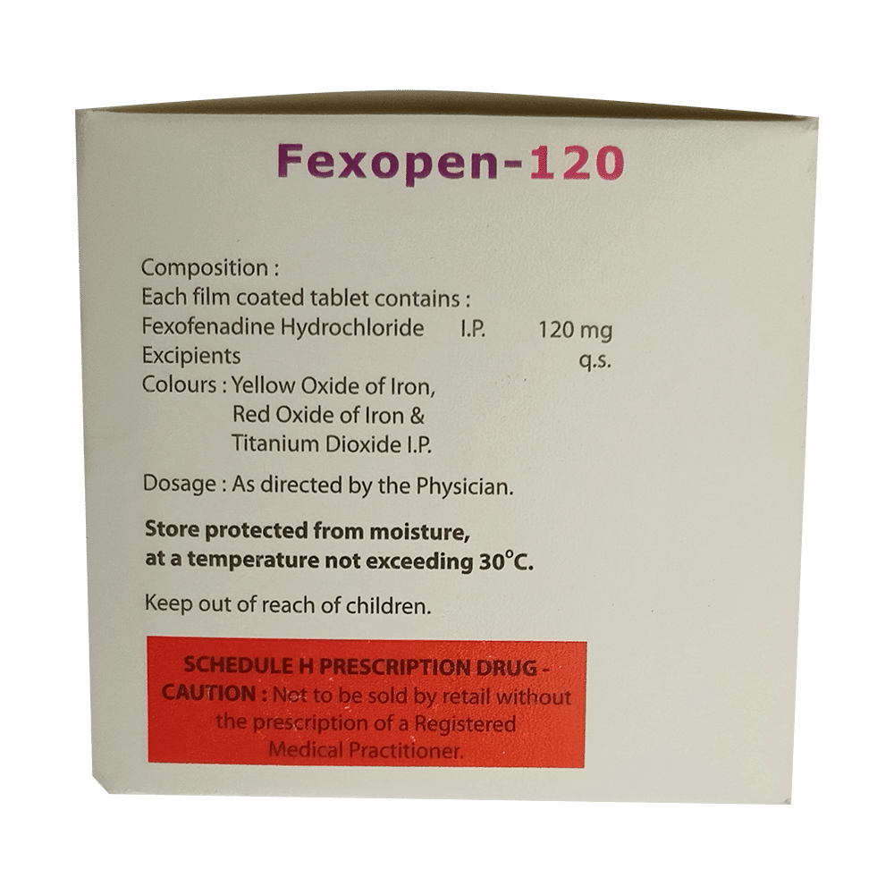 Fexopen 120 Tablet is an anti-allergy medicine used in the treatment of allergic symptoms such as runny nose, congestion or stuffiness, sneezing, itching, swelling, and watery eyes. It also helps treat skin allergies with itching, redness, or swelling. Fexopen 120 Tablet may be taken with or without food, in the dose and duration as advised by the doctor. The dose you are given will depend on your condition and how you respond to the medicine. You should keep taking this medicine for as long as your doctor recommends. Do not stop taking it without consulting your doctor.The most common side effects are headache, drowsiness, dizziness, and nausea. Most of these are temporary and usually resolve with time. Please consult your doctor if any of these side effects do not resolve or persist for a longer duration.Do not self-medicate or recommend your medicine to another person even if you see the similarity in symptoms. Consult your doctor to get the most benefit. Inform your doctor if you are suffering from any problems related to the kidneys, liver, or heart. Pregnant and breastfeeding mothers should not take this medicine without consulting a doctor.