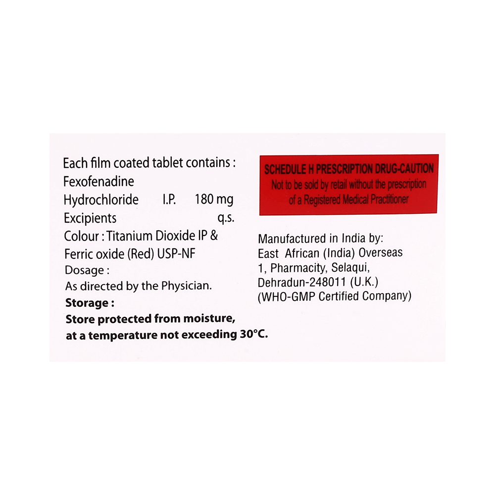 In Treatment of Sneezing and runny nose due to allergiesFexoskin 180 Tablet provides relief from symptoms such as sneezing, itching, watery eyes, and runny nose. This will make it easier for you to go about your daily activities. It rarely has any serious side effects and you may only need to take it on days you have symptoms. If you are taking it to prevent getting symptoms you should use it regularly to get the most benefit.