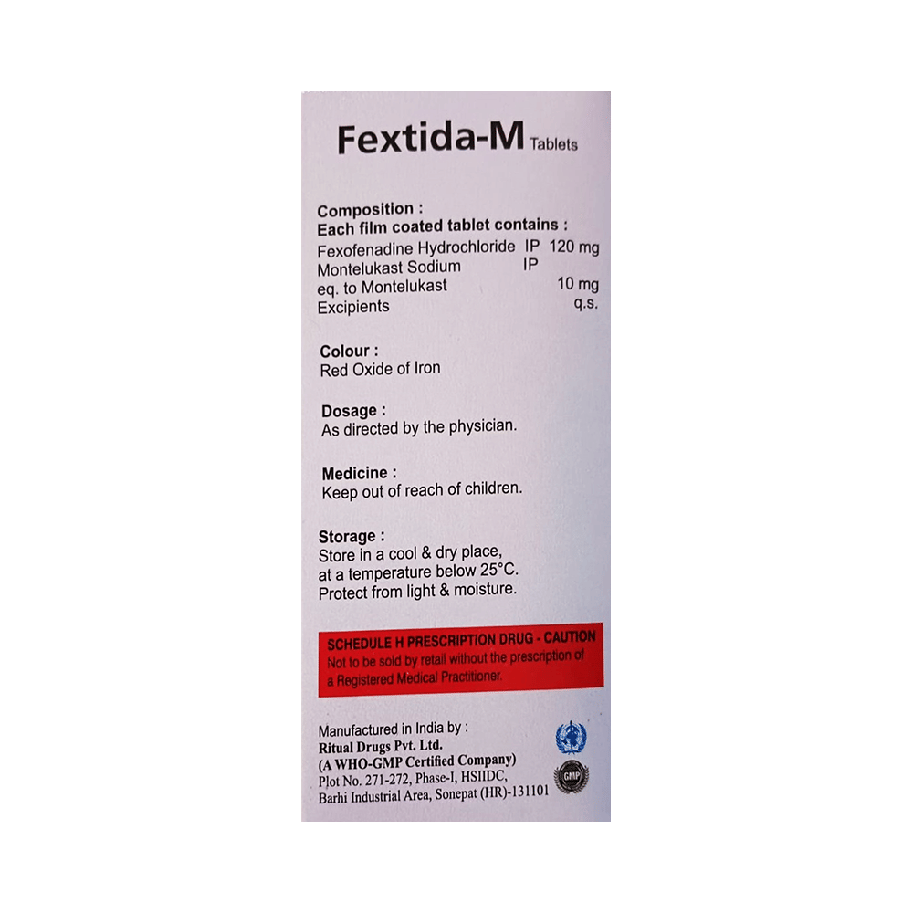 Fextida-M Tablet is a combination medicine used in the treatment of allergy symptoms such as runny nose, stuffy nose, sneezing, watery eyes, and congestion or stuffiness. Fextida-M Tablet is taken with or without food in a dose and duration as advised by the doctor. The dose you are given will depend on your condition and how you respond to the medicine. You should keep taking this medicine for as long as your doctor recommends. If you stop treatment too early your symptoms may come back and your condition may worsen. Let your healthcare team know about all other medications you are taking as some may affect, or be affected by this medicine.The most common side effects include nausea, diarrhea, vomiting, skin rash, flu-like symptoms, and headache. Most of these are temporary and usually resolve with time. Contact your doctor straight away if you are at all concerned about any of these side effects. This medicine may cause dizziness and sleepiness, so do not drive or do anything that requires mental focus until you know how this medicine affects you. Avoid drinking alcohol while taking this medicine as it can worsen your sleepiness.Never support self-medication or recommend your medicine to another person. It is beneficial to have plenty of fluids while taking this medication. Before you start taking this medicine it is important to inform your doctor if you are suffering from liver or kidney disease. You should also tell your doctor if you are pregnant, planning pregnancy or breastfeeding.