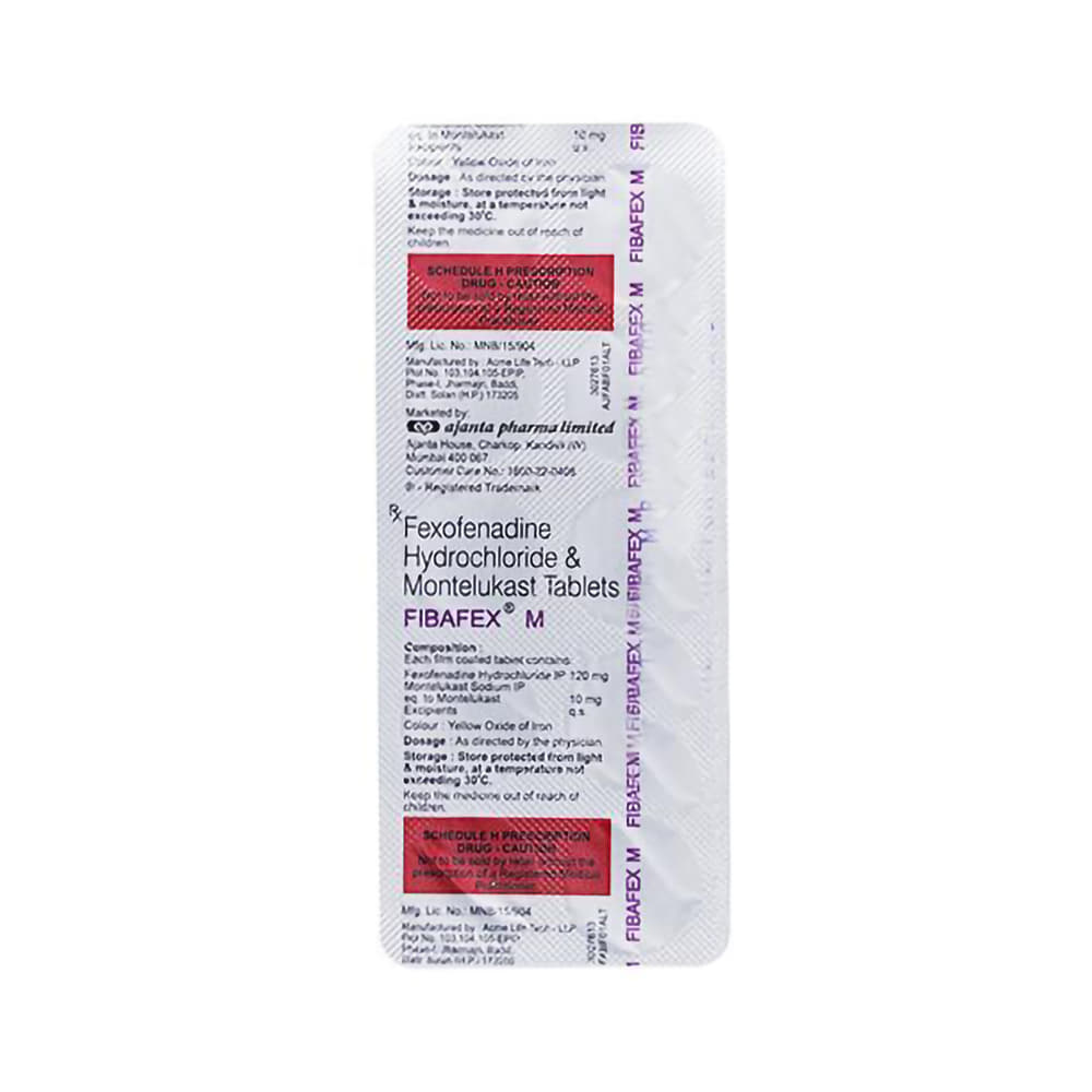 Fibafex M 10mg/120mg Tablet is a combination medicine used in the treatment of allergy symptoms such as runny nose, stuffy nose, sneezing, watery eyes, and congestion or stuffiness. Fibafex M 10mg/120mg Tablet is taken with or without food in a dose and duration as advised by the doctor. The dose you are given will depend on your condition and how you respond to the medicine. You should keep taking this medicine for as long as your doctor recommends. If you stop treatment too early your symptoms may come back and your condition may worsen. Let your healthcare team know about all other medications you are taking as some may affect, or be affected by this medicine.The most common side effects include nausea, diarrhea, vomiting, skin rash, flu-like symptoms, and headache. Most of these are temporary and usually resolve with time. Contact your doctor straight away if you are at all concerned about any of these side effects. This medicine may cause dizziness and sleepiness, so do not drive or do anything that requires mental focus until you know how this medicine affects you. Avoid drinking alcohol while taking this medicine as it can worsen your sleepiness.Never support self-medication or recommend your medicine to another person. It is beneficial to have plenty of fluids while taking this medication. Before you start taking this medicine it is important to inform your doctor if you are suffering from liver or kidney disease. You should also tell your doctor if you are pregnant, planning pregnancy or breastfeeding.