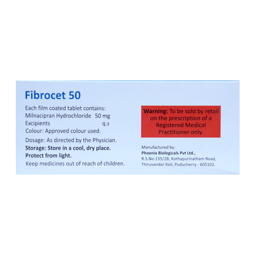 Fibrocet 50 Tablet is a prescription medicine used in the treatment of fibromyalgia (a condition in which there are generalized pain and tenderness in the body) and depression. It works by increasing the level of chemical messengers (serotonin and noradrenaline), helping in faster recovery. Fibrocet 50 Tablet may be taken with or without food. It is advised to take this medicine at a fixed time each day to maintain a consistent level in the blood. If you miss any doses, take it as soon as you remember. Do not skip any doses and finish the full course of treatment even if you feel better. This medication mustn't be stopped suddenly as it may worsen your symptoms.Some common side effects of this medicine include nausea, vomiting, insomnia (difficulty sleeping), constipation, anxiety, decreased appetite, increased sweating, and sexual dysfunction. It even causes dizziness and sleepiness, so do not drive or do anything that requires mental focus until you know how this medicine affects you. However, these side effects are temporary and usually resolve on their own in some time. Please consult your doctor if these do not subside or bother you.Before taking Fibrocet 50 Tablet, inform your doctor if you have any problems with your kidneys, heart, liver, or have a history of seizures (epilepsy or fits). Inform your doctor if you develop any unusual changes in mood or behavior, new or worsening depression, or if you have any suicidal thoughts.