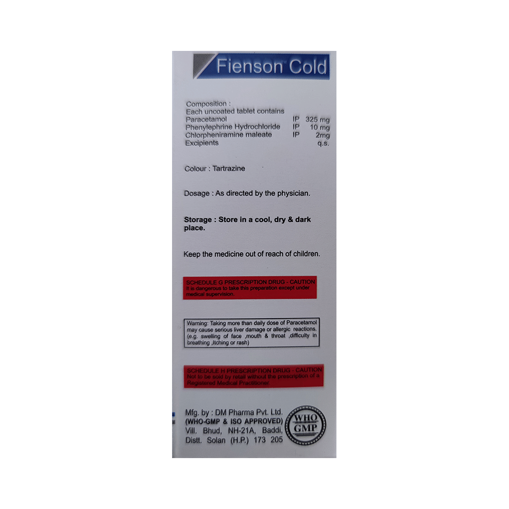 Fienson Cold Tablet is a medicine used in the treatment of common cold symptoms. It provides relief from symptoms such as headache, sore throat, runny nose, muscular pain, and fever. Fienson Cold Tablet can be taken with or without food. The dose and duration will depend on the severity of your condition. You should keep taking the medicine even if you feel better until the doctor says it is alright to stop using it.Using this medicine may cause a few common side effects such as nausea, vomiting, sleepiness, dizziness, and headache. If any of these side effects do not resolve with time or get worse, you should let your doctor know. Your doctor may be able to suggest ways of preventing or reducing the side effects. In general, you should try to use the smallest amount necessary to control your symptoms.Before using the medicine, you should tell your doctor if you have any other medical conditions or disorders. To make sure it is safe, you should let your doctor know all the other medicines you are taking. Also, tell your doctor if you have any problems with the liver or kidneys. Avoid consumption of alcohol while on treatment with this medicine as it may increase the chance of some side effects. Pregnant and breastfeeding women should consult their doctors first before using the medicine.