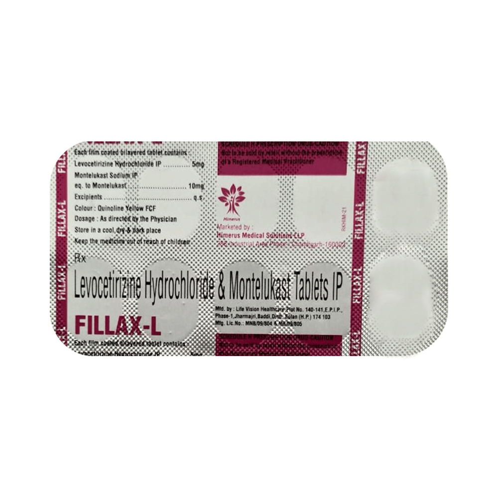 In Treatment of Allergic skin conditionsFillax-L Tablet is effective in treating allergic skin conditions with inflammation and itching. It reduces the actions of chemicals in the body that cause inflammation of the skin. When used correctly it is a safe and effective treatment. It reduces the redness, rash, pain or itchiness caused by your skin’s reaction to an irritant. It thus improves your self-esteem and confidence as your appearance changes. Keep taking it for as long as it is prescribed to get the full benefits.In Treatment of Sneezing and runny nose due to allergiesFillax-L Tablet is a combination medicine that provides relief from symptoms such as blocked or runny nose, sneezing and itchy or watery eyes. This will make it easier for you to go about your daily activities. It rarely has any serious side effects and you may only need to take it on days you have symptoms. If you are taking it to prevent getting symptoms you should use it regularly to get the most benefit.In Treatment of Hay feverHay fever, also called allergic rhinitis, causes cold-like signs and symptoms, such as a runny nose, itchy eyes, congestion, sneezing and sinus pressure. The only difference is that in hay fever, these symptoms are not produced due to a virus but are simply allergic responses of our body to allergens (allergy causing agents such as pollen). Fillax-L Tablet is used to provide relief from these symptoms of hay fever. It works by blocking the release of the chemical substance responsible for producing such allergy symptoms. Fillax-L Tablet is a safe medicine which helps treat hay fever and makes us feel at ease.show moreshow less