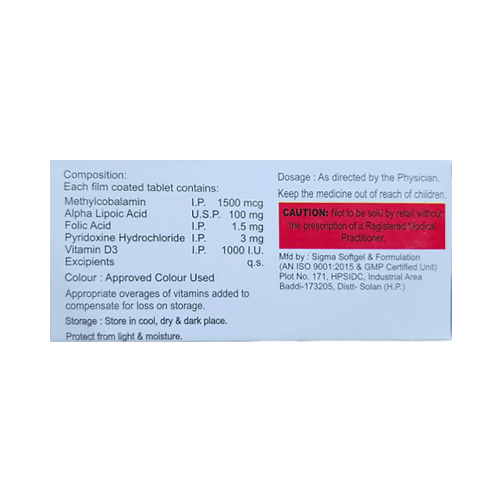 Salt Composition: Methylcobalamin (1500mcg) + Alpha Lipoic Acid (100mg) + Vitamin B6 (Pyridoxine) (3mg) + Folic Acid (1.5mg) + Vitamin D3 (1000IU)