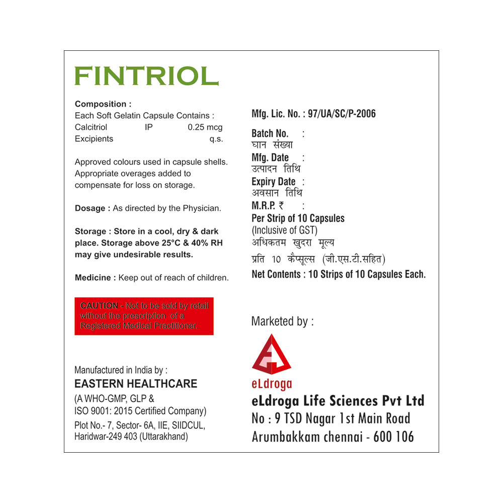 Fintriol Capsule is the active form of vitamin D. It increases the levels of vitamin D in your blood which in turn raises calcium levels in the blood by helping in the absorption of more calcium from your intestine. This way it helps in the treatment of calcium deficiency and metabolic bone disease. Fintriol Capsule is also beneficial in increasing muscle mass, helps in the prevention and treatment of hypocalcemia, as well as helps in reducing fatigue and muscular pains. It boosts immunity and increases body resistance against infection.This medicine is to be taken in the dosage as advised by the doctor. Consult your doctor if you plan to take any other form of vitamin D along with this medicine.This medicine is generally tolerated with little or no side effects. In patients with kidney disease patients, dose adjustment may be required. Discussed with your doctor. Avoid or limit the consumption of alcohol while on treatment with this medicine.