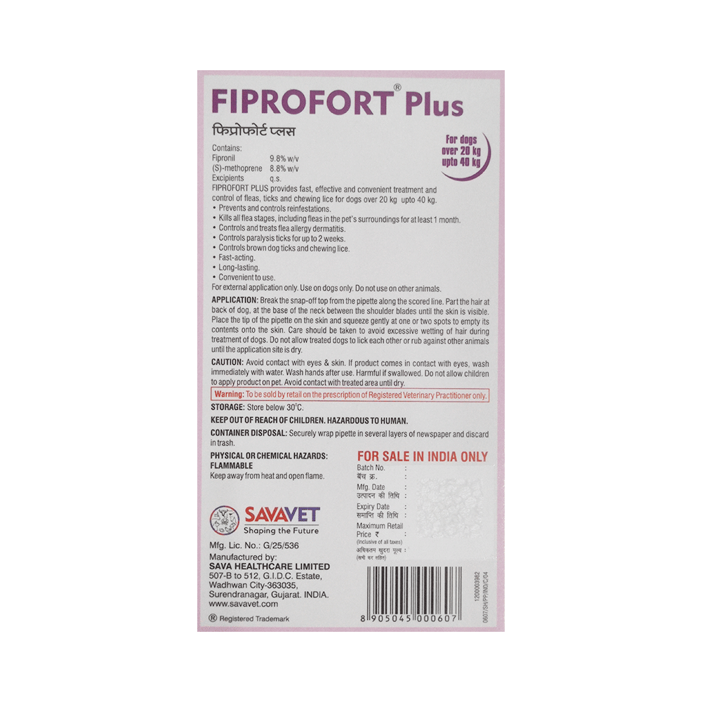 Explore the benefits of Fiprofort Plus Pet Solution For Dogs Over 20 Kg Upto 40 Kg. Use as directed by your physician or as described in the instructions.