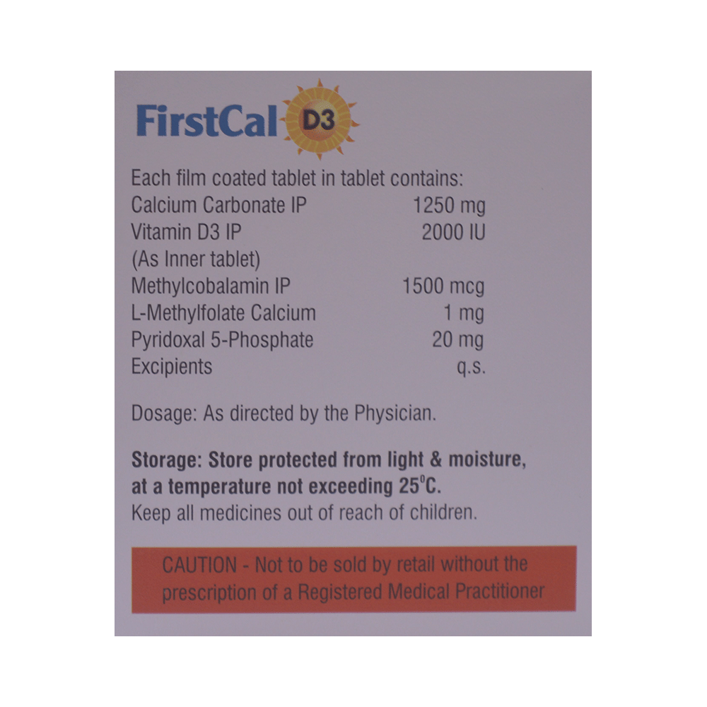 Firstcal D3 Tablet is a combination of five medicines : Calcium Carbonate, Vitamin D3, Methylcobalamin, L-Methyl Folate Calcium, and Pyridoxal-5-phosphate. Calcium carbonate is a dietary supplement used when the amount of calcium taken in the diet is not enough. Vitamin D3 is a form of vitamin D. It raises vitamin D levels in your blood. This in turn raises calcium levels in your blood by helping you absorb more calcium from food. Methylcobalamin is a form of vitamin B12 that restores its level in the body thereby helping in treating certain anemias and nerve problems. L-Methyl Folate Calcium and Pyridoxal-5-phosphate are nutritional supplements that provide essential nutrients to our body and improve overall health.