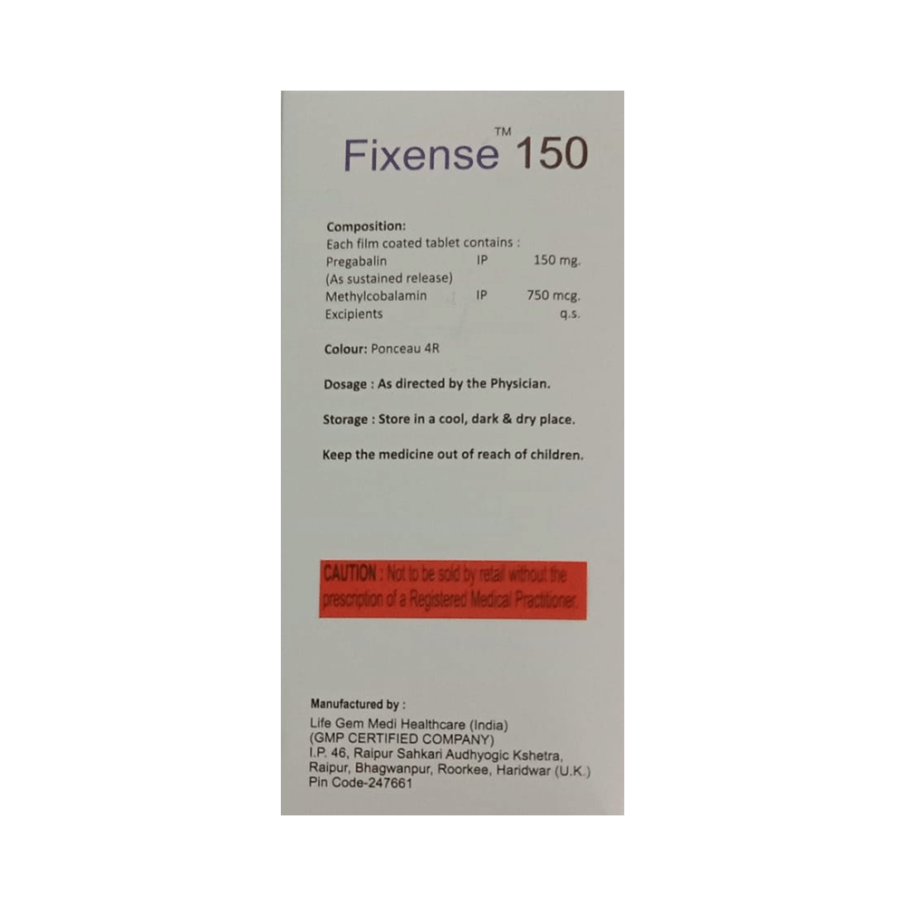 Fixense 150 Tablet is a prescription medicine used for the treatment of neuropathic pain. It decreases pain by modulating the calcium channel activity of the nerve cells. This medicine also protects nerve fibers and heals damaged nerve cells. Fixense 150 Tablet may be taken with or without food, preferably at bedtime. It is advised to take it at the same time each day as this helps to maintain a consistent level of medicine in the body. Take this medicine in the dose and duration advised by your doctor. If you miss a dose of this medicine, take it as soon as you remember. Finish the full course of treatment even if you feel better. This medication must not be stopped suddenly without talking to the doctor.Some common side effects of this medicine include nausea, vomiting, diarrhea, constipation, blurred vision, dizziness, and sleepiness. Do not drive or do anything that requires mental focus until you know how this medicine affects you. The side effects are mild and usually improve with time. It may also cause weight gain in some people. Exercise regularly and have a balanced diet to keep your weight in check. Inform your doctor if you develop any unusual changes in mood or behavior, new or worsening depression, or suicidal thoughts.Your doctor should also know about all other medicines you are taking, as many of these may make this medicine less effective or change the way it works. Inform your doctor if you are pregnant, planning pregnancy, or breastfeeding to make sure it is safe for you and the developing baby.