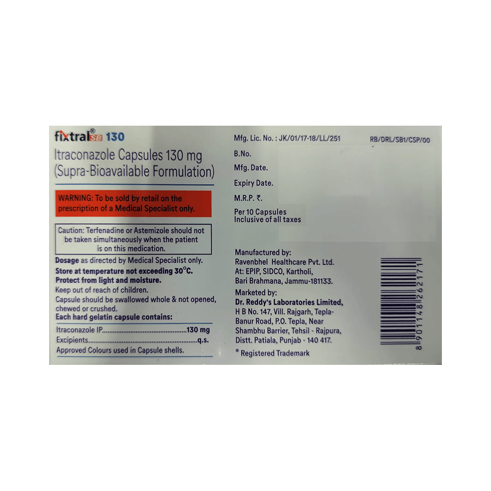 In Treatment of Fungal infectionsFixtral SB 130mg Capsule is an antifungal medicine. It is used to treat infections in different parts of the body caused by fungi. It works by killing and stopping the growth of fungi. This provides relief from various symptoms caused by the infection and speeds up the healing process. You should keep taking the medicine until you complete the dose even if you get better. This will prevent the infection from returning.