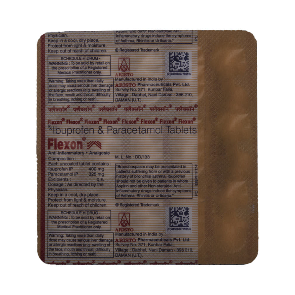 Flexon Tablet is a combination of two medicines: Ibuprofen and Paracetamol. It works by blocking the release of certain chemical messengers that cause fever, pain and inflammation (redness and swelling).