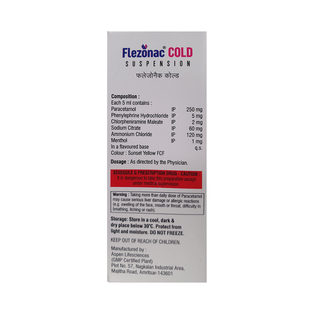 Flezonac Cold Oral Suspension Orange is commonly prescribed to treat symptoms such as runny nose, cough, sneezing, watery eyes, sore throat, body ache, and fever. These symptoms are usually associated with the common cold, hay fever (allergic rhinitis), and other respiratory tract conditions. Flezonac Cold Oral Suspension Orange is to be given by mouth with or without food. Take it at a fixed time each day to avoid missing a dose. However, never repeat the dose if it's already time for the next dose. You may start to feel better within a week of regular dosing. Although, continue the medicine to finish the prescribed course, as stopping it abruptly may worsen the condition.Some of the minor and temporary side effects that one may experience while taking this medicine include vomiting, diarrhea, nausea, dizziness, rash, and headache. Usually, these episodes subside once the body adapts to the medicine. In case these side effects persist or become bothersome, consult the doctor without any delay.Discuss the medical history, including any ongoing medicine regime or history of any allergy, heart problem, blood disorder, breathing issues, skin disorder, or liver or kidney disease, with the doctor before starting the treatment with Flezonac Cold Oral Suspension Orange. This information is critical for dose alterations and planning your overall treatment.