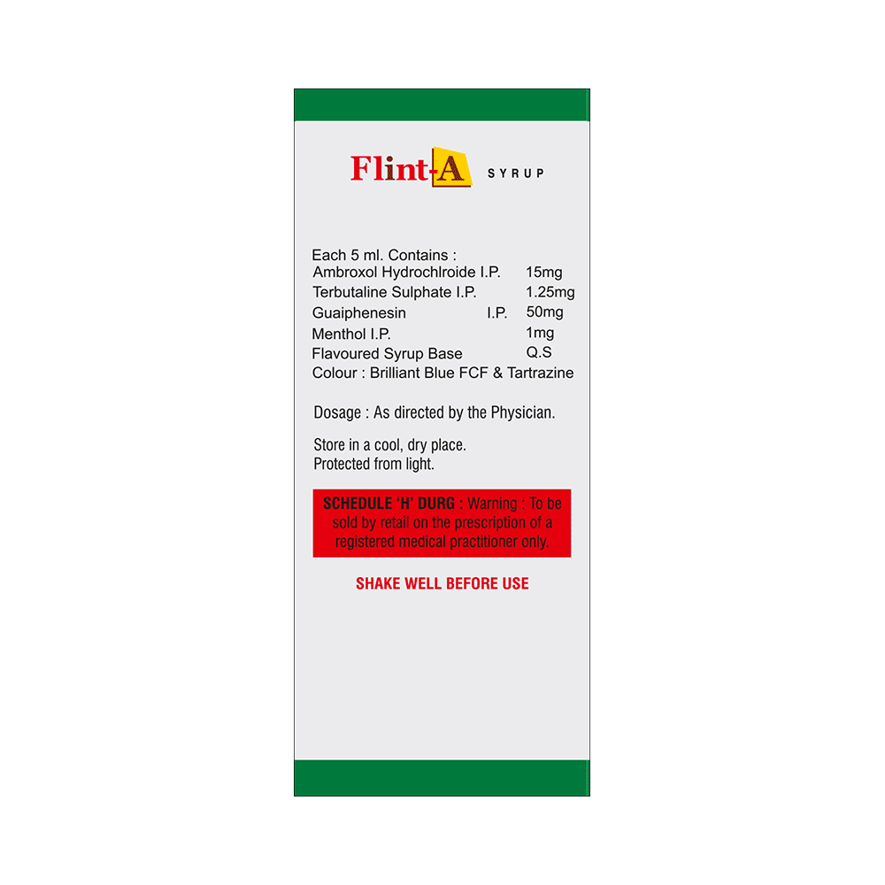 Flint-A Syrup is a combination medicine used to treat cough. It thins the mucus in the nose and windpipe, making it easier to cough out. This medicine also relieves throat irritation and provides cooling sensation. Flint-A Syrup is taken with or without food in a dose and duration as advised by the doctor. The dose you are given will depend on your condition and how you respond to the medicine. You should keep taking this medicine for as long as your doctor recommends. If you stop treatment too early your symptoms may come back and your condition may worsen. Let your doctor know about all other medications you are taking as some may affect, or be affected by this medicine.The most common side effects are nausea, diarrhea, vomiting, stomach discomfort, headache, rash, tremor, and increased heart rate. Most of these are temporary and usually resolve with time. Contact your doctor straight away if you are at all concerned about any of these side effects. This medicine can also cause sleepiness, so do not drive or do anything that requires mental focus until you know how this medicine affects you. Avoid drinking alcohol while taking this medicine as it can make sleepiness worse.Never support self-medication or recommend your medicine to another person. It is beneficial to have plenty of fluids while taking this medication. Before taking this medicine, you should tell your doctor if you are pregnant, planning pregnancy or breastfeeding.