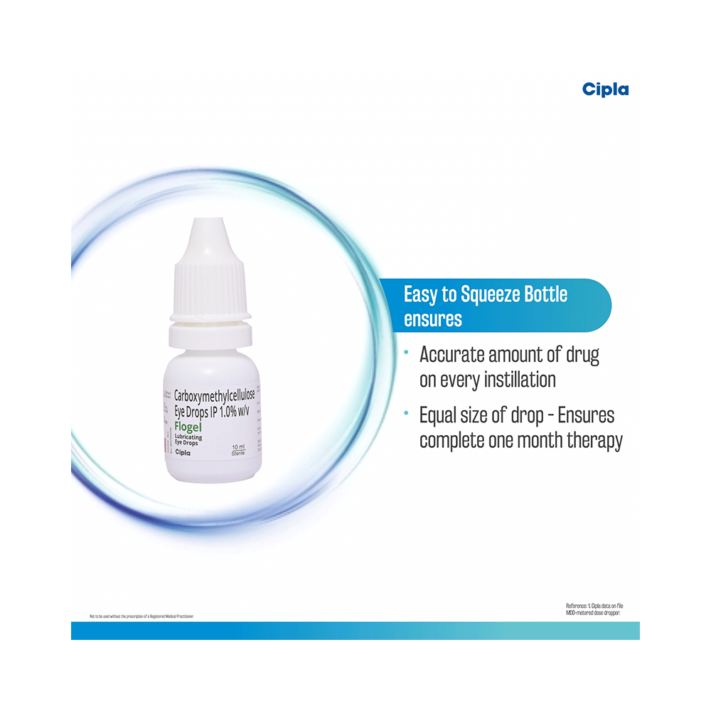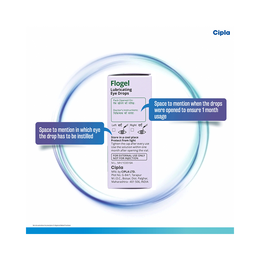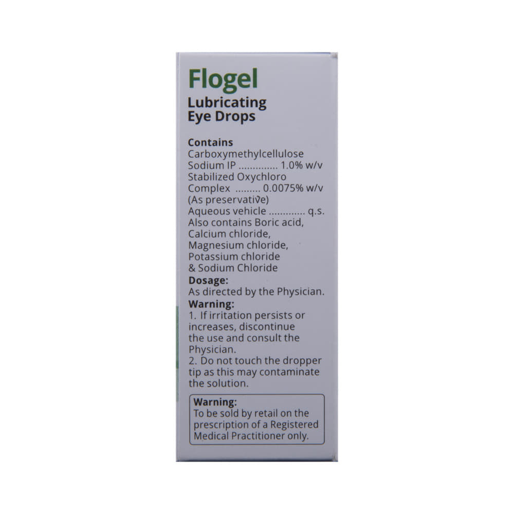 Flogel Eye Drop is an eye lubricant or artificial tears used to relieve dry eyes. This can happen because not enough tears are made to keep the eye lubricated. It helps to soothe the irritation and burning seen in dry eyes by maintaining proper lubrication of the eyes. Flogel Eye Drop is usually taken when needed. Use the number of drops as advised by your doctor. Wait for at least 5-10 minutes before delivering any other medication in the same eye to avoid dilution. Do not use a bottle if the seal is broken before you open it. Always wash your hands and do not touch the end of the dropper. This could infect your eye. This medicine may require long-term use and can be taken safely for as long as you need it.The most common side effects of using this medicine are blurred or altered vision, redness or irritation and sometimes pain in the eye. Let your doctor know if you experience these symptoms but they are usually temporary. Do not drive, use machinery, or do any activity that requires clear vision until you are sure you can do it safely. Consult your doctor if your condition does not improve or if the side effects bother you.This medicine is not likely to affect or be affected by other medicines you use but tell your doctor if you have ever had glaucoma. Do not use it while wearing soft contact lenses and talk to your doctor if you develop an eye infection while using it.
