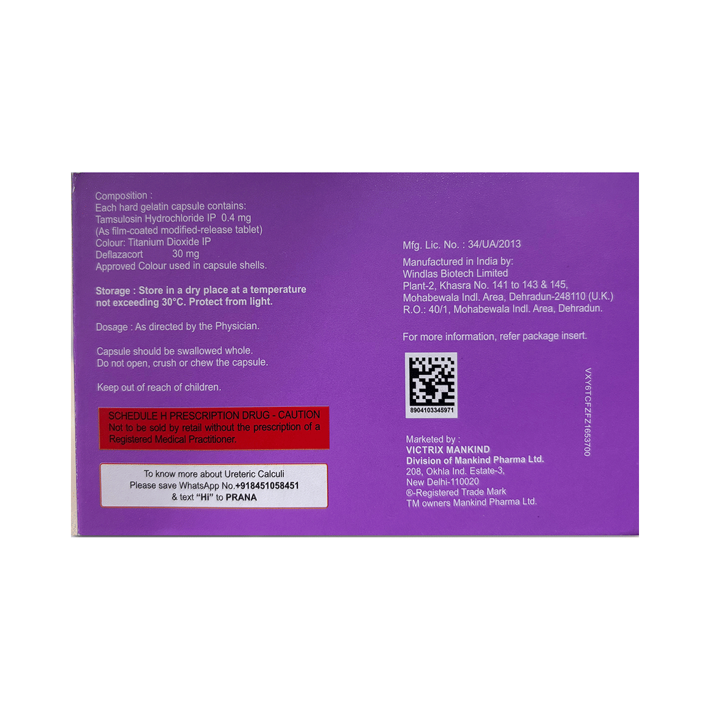 Salt Composition: Tamsulosin (0.4mg) + Deflazacort (30mg)