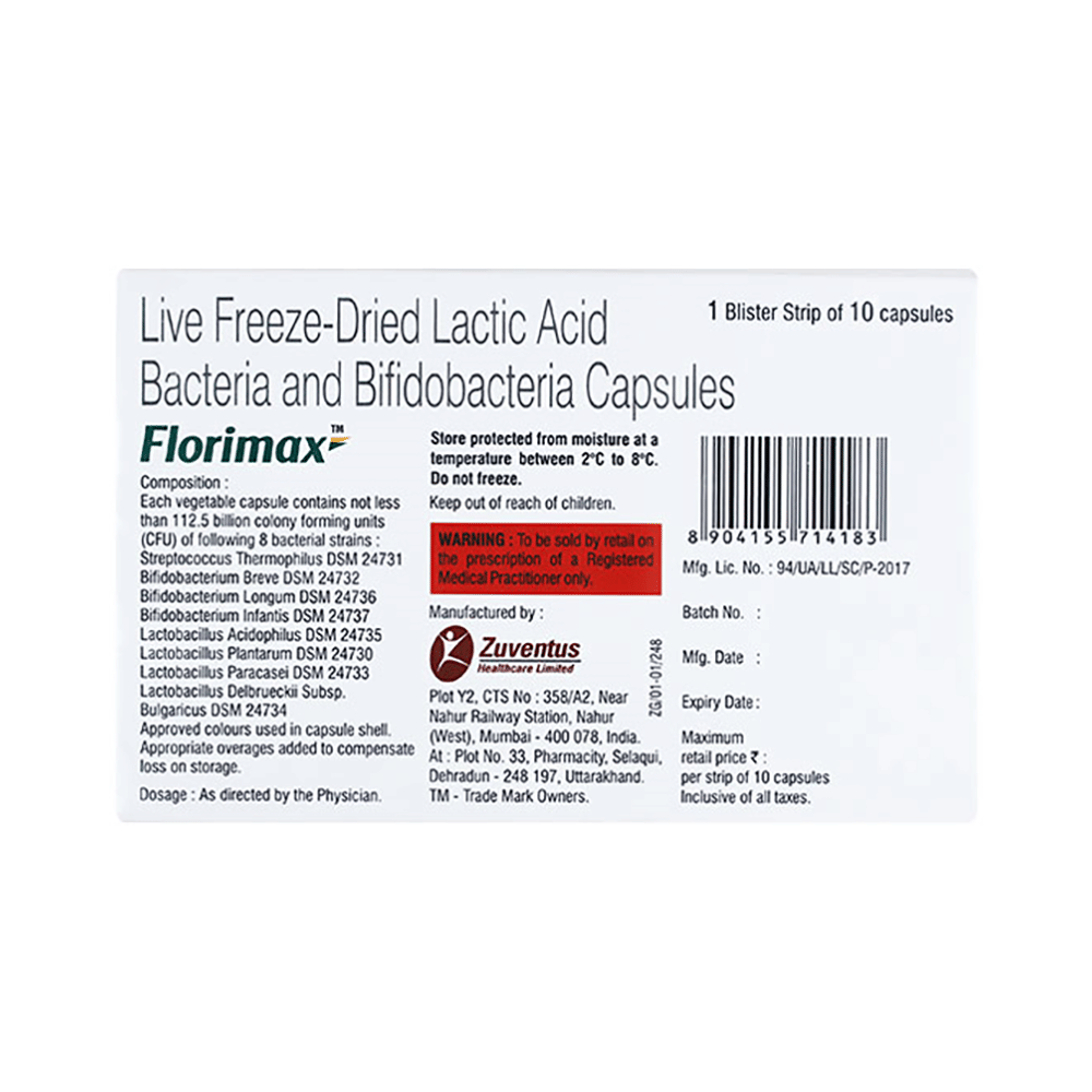 Florimax Capsule has good bacteria that have gastrointestinal (GI) protective properties and maintain a healthy digestive tract (stomach and intestines). It is used to treat irritable bowel syndrome (symptoms include abdominal pain, cramping, bloating, diarrhea, or constipation) and ulcerative colitis. Florimax Capsule may be taken with or without food. Take it in a dose and for the duration as advised by the doctor. Keep using the medication as directed until your doctor advises you to discontinue it. Consult your doctor if you are taking any other medicine, especially steroids or antibiotics, along with this medicine.There is limited data on the side effects of Florimax Capsule. Let your doctor know if you experience any symptoms while taking the medicine. They may be able to suggest ways to treat or manage the side effects.Inform your doctor about any existing medical conditions before starting this medication. Pregnant or breastfeeding women should also consult their doctor before using this medicine to make sure it is safe for them.