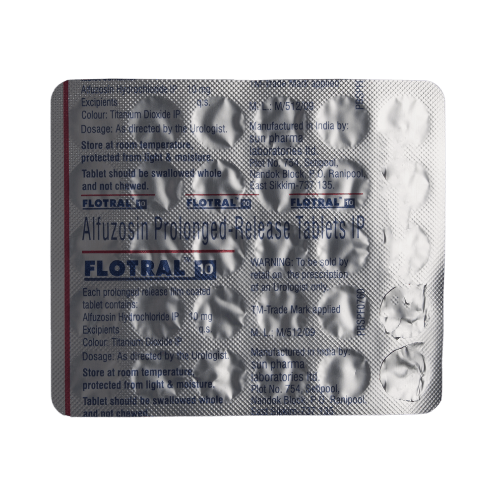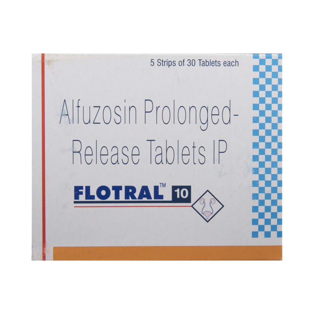 Flotral 10 Tablet PR is an alpha-adrenergic antagonist that is used in the treatment of benign prostatic hyperplasia. It helps to relieve symptoms like difficulty in passing urine. However, it does not decrease the size of the prostate. Flotral 10 Tablet PR is advised to take it in a dose and duration as per prescription. It should be taken with food, but take at the same time regularly. Swallow the medicine as a whole without crushing or chewing it. You should not stop taking the medicine without consulting the doctor as it may lead to the worsening of your symptoms. The course of the treatment should be completed for better efficacy of the medicine.Some common side effects of this medicine are upper respiratory tract infection, dizziness, headache, nausea, abdominal pain, and impotence. It may also lead to blurry vision or dizziness, so it is advised to avoid driving while on the medication. If any of the side effects persist or bother you, you must consult the doctor without delay.Simple lifestyle changes can help you manage your symptoms better. Try to urinate as soon as you feel the urge, however, never strain or push to empty your bladder. You should avoid drinking caffeinated or alcoholic drinks at night and a few hours before going to bed or going out.Before receiving the treatment, inform your doctor if you are on any medication for any other health condition. If you have to undergo eye surgery due to cataracts or glaucoma then inform your eye doctor about the usage of this medicine. Patients with liver or kidney disease must be cautious while receiving the prescription, and they must receive regular follow-ups as per the doctor’s advice.