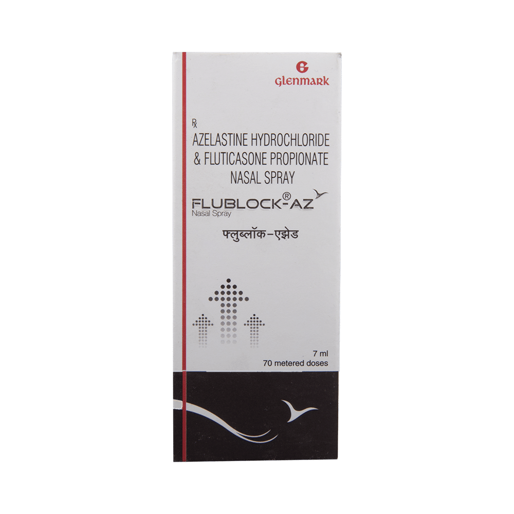 Flublock-AZ Nasal Spray is a combination of two medicines: Fluticasone Propionate and Azelastine, which relieves sneezing and runny nose caused due to allergies (allergic rhinitis). Fluticasone Propionate is a steroid which works by blocking the release of certain chemical messengers that cause inflammation (swelling) and irritation in the nose. Azelastine is an antiallergic which relieves allergy symptoms like runny nose, watery eyes and sneezing.