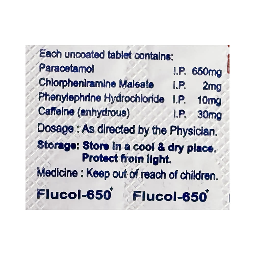 Flucol 650 Tablet is a combination of four medicines: Caffeine, Chlorpheniramine Maleate, Paracetamol, and Phenylephrine, which relieves common cold symptoms.