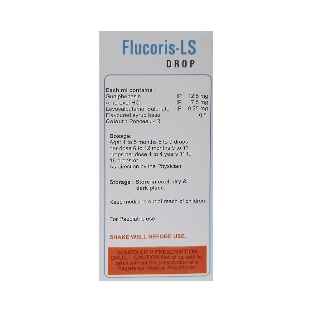 Flucoris-LS Oral Drops is a combination medicine used in the treatment of cough with mucus. It thins mucus in the nose, windpipe, and lungs, making it easier to cough out. It also provides relief from runny nose, sneezing, itching, and watery eyes. Flucoris-LS Oral Drops is taken with or without food in a dose and duration as advised by the doctor. The dose you are given will depend on your condition and how you respond to the medicine. You should keep taking this medicine for as long as your doctor recommends. If you stop treatment too early your symptoms may come back and your condition may worsen. Let your healthcare team know about all other medications you are taking as some may affect, or be affected by this medicine.The most common side effects are nausea, diarrhea, stomach pain, vomiting, muscle cramp, headache, skin rash, and increased heart rate. Most of these are temporary and usually resolve with time. Contact your doctor straight away if you are at all concerned about any of these side effects. This medicine can also cause sleepiness, so do not drive or do anything that requires mental focus until you know how this medicine affects you. Avoid drinking alcohol while taking this medicine as it can make sleepiness worse.Never support self-medication or recommend your medicine to another person. It is beneficial to have plenty of fluids while taking this medication. Before taking this medicine, you should tell your doctor if you are pregnant, planning pregnancy, or breastfeeding. You should also tell your doctor if you have any kidney or liver diseases so that your doctor can prescribe a suitable dose for you.