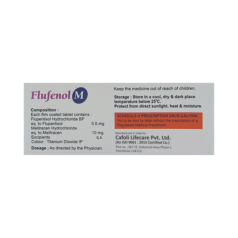 Flufenol M Tablet is a combination of two medicines: Flupenthixol and Melitracen. Flupenthixol is a typical antipsychotic. It works by blocking the action of dopamine, a chemical messenger in the brain that affects thoughts and mood. Melitracen is a tricyclic antidepressant which increases the levels of chemical messengers in the brain that help in regulating the mood and treat depression.