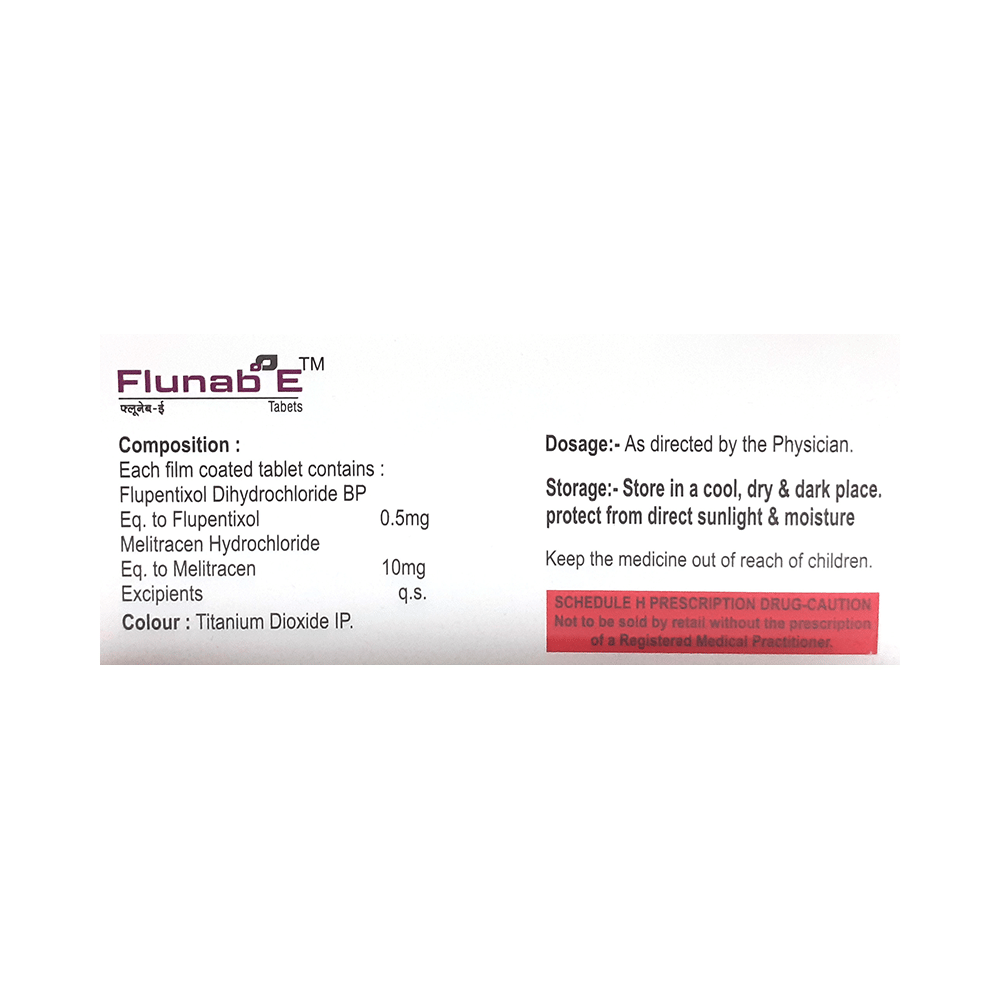 Flunab E Tablet is a combination of two medicines: Flupenthixol and Melitracen. Flupenthixol is a typical antipsychotic. It works by blocking the action of dopamine, a chemical messenger in the brain that affects thoughts and mood. Melitracen is a tricyclic antidepressant which increases the levels of chemical messengers in the brain that help in regulating the mood and treat depression.