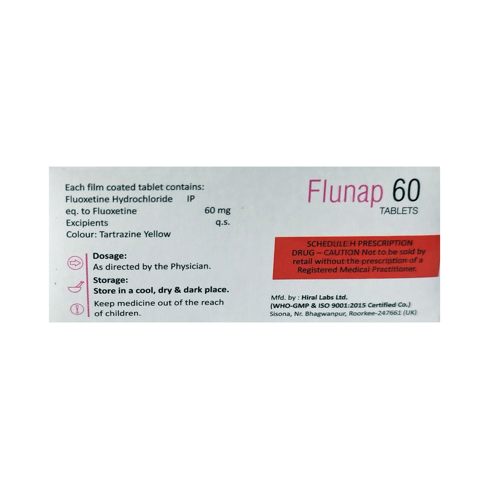 Flunap 60 Tablet is a type of antidepressant belonging to the selective serotonin reuptake inhibitor (SSRI) group of medicines. It is widely prescribed to treat depression and other mental health conditions like panic disorder and obsessive-compulsive disorder. Flunap 60 Tablet helps many people to recover from depression by improving their mood and relieving anxiety and tension. It is also used to treat bulimia nervosa (an eating disorder), where it reduces binge-eating and purging (vomiting).The dose and how often you need it will be decided by your doctor so that you get the right amount to control your symptoms. Your doctor may start you on a lower dose and increase it gradually. Do not change the dose or stop taking it without talking to your doctor, even if you feel well. Doing so may make your condition worse or you may suffer from unpleasant withdrawal symptoms (anxiety, restlessness, palpitations, dizziness, sleep disturbances, etc).To get the most benefit, take this medicine regularly at the same time each day. It may take a few weeks before you start feeling better. Let your doctor know if you do not see any improvement even after 4 weeks. Some common side effects of Flunap 60 Tablet include nausea, indigestion, dry mouth, fatigue, loss of appetite, increased sweating, sinusitis, insomnia (difficulty in sleeping), yawning, and abnormal dreams. Sexual side effects like decreased sexual drive delayed ejaculation, and erectile dysfunction may also be seen. Let your doctor know straight away if you develop any sudden worsening of mood or any thoughts about harming yourself.Before taking this medicine, you should tell your doctor if you have epilepsy (seizure disorder or fits), diabetes, liver or kidney disease, heart problems, or glaucoma. These may affect your treatment. Pregnant or breastfeeding women should also consult their doctor before taking it. Some other medicines may affect the way it works, especially other antidepressants and medicines called MAO inhibitors. Please tell your doctor about all the medicines you are taking to make sure you are safe.