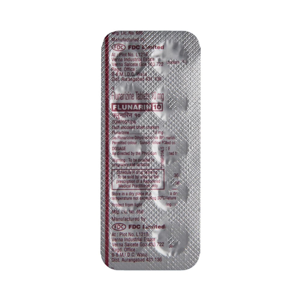 Flunarin 10 Tablet is a medicine used for the prevention of migraines. However, it cannot treat an acute attack and will only work to prevent migraines for as long as you continue to take the medicine. This medicine relaxes the brain, preventing migraine headaches. Flunarin 10 Tablet may be taken with or without food. However, it is advised to take it at the same time each day, as this helps maintain a consistent level of medicine in the body. Do not skip any doses, and finish the full course of treatment even if you feel better. If you have missed a dose, take it as soon as you remember. You should continue to take this medicine for as long as the doctor advises and do not stop taking it suddenly.Side effects associated with the use of Flunarin 10 Tablet include muscle pain, fatigue, constipation, nausea, insomnia (difficulty sleeping), and a runny nose. Some other side effects that may be seen on taking this medicine are increased appetite, depression, stomach discomfort, and breast pain.Flunarin 10 Tablet may also cause sleepiness at the beginning of your treatment, so do not drive or operate machinery until you know how this medicine affects you. It may also cause weight gain, and to prevent it, you can eat a healthy, balanced diet and exercise regularly. This medicine may cause changes in your mood, and you may feel depressed; therefore, regular monitoring of behavior is important. Pregnant or breastfeeding mothers should consult their doctor before taking this medicine.