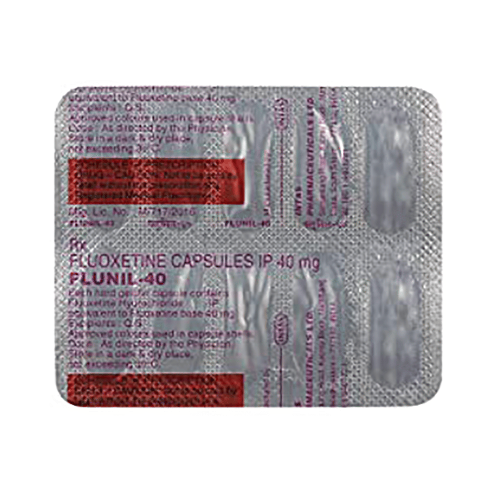 FLUnil 40 Capsule is a type of antidepressant belonging to the selective serotonin reuptake inhibitor (SSRI) group of medicines. It is widely prescribed to treat depression and other mental health conditions like panic disorder and obsessive-compulsive disorder. FLUnil 40 Capsule helps many people to recover from depression by improving their mood and relieving anxiety and tension. It is also used to treat bulimia nervosa (an eating disorder), where it reduces binge-eating and purging (vomiting).The dose and how often you need it will be decided by your doctor so that you get the right amount to control your symptoms. Your doctor may start you on a lower dose and increase it gradually. Do not change the dose or stop taking it without talking to your doctor, even if you feel well. Doing so may make your condition worse or you may suffer from unpleasant withdrawal symptoms (anxiety, restlessness, palpitations, dizziness, sleep disturbances, etc).To get the most benefit, take this medicine regularly at the same time each day. It may take a few weeks before you start feeling better. Let your doctor know if you do not see any improvement even after 4 weeks. Some common side effects of FLUnil 40 Capsule include nausea, indigestion, dry mouth, fatigue, loss of appetite, increased sweating, sinusitis, insomnia (difficulty in sleeping), yawning, and abnormal dreams. Sexual side effects like decreased sexual drive delayed ejaculation, and erectile dysfunction may also be seen. Let your doctor know straight away if you develop any sudden worsening of mood or any thoughts about harming yourself.Before taking this medicine, you should tell your doctor if you have epilepsy (seizure disorder or fits), diabetes, liver or kidney disease, heart problems, or glaucoma. These may affect your treatment. Pregnant or breastfeeding women should also consult their doctor before taking it. Some other medicines may affect the way it works, especially other antidepressants and medicines called MAO inhibitors. Please tell your doctor about all the medicines you are taking to make sure you are safe.