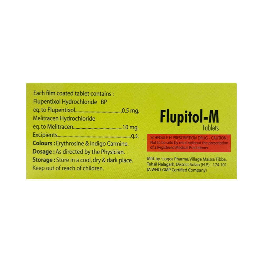 Flupitol-M Tablet is a combination of two medicines: Flupenthixol and Melitracen. Flupenthixol is a typical antipsychotic. It works by blocking the action of dopamine, a chemical messenger in the brain that affects thoughts and mood. Melitracen is a tricyclic antidepressant which increases the levels of chemical messengers in the brain that help in regulating the mood and treat depression.