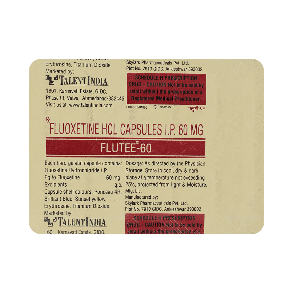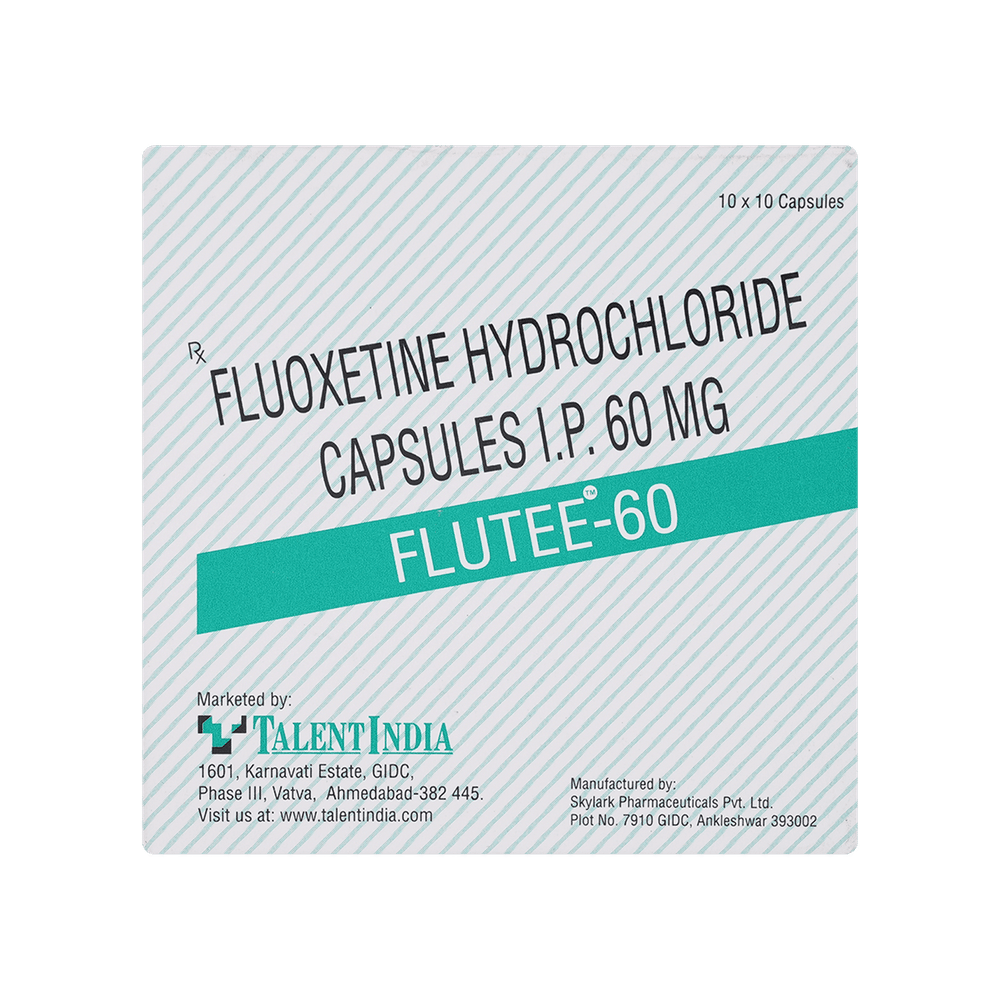 FLUtee 60mg Capsule is a type of antidepressant belonging to the selective serotonin reuptake inhibitor (SSRI) group of medicines. It is widely prescribed to treat depression and other mental health conditions like panic disorder and obsessive-compulsive disorder. FLUtee 60mg Capsule helps many people to recover from depression by improving their mood and relieving anxiety and tension. It is also used to treat bulimia nervosa (an eating disorder), where it reduces binge-eating and purging (vomiting).The dose and how often you need it will be decided by your doctor so that you get the right amount to control your symptoms. Your doctor may start you on a lower dose and increase it gradually. Do not change the dose or stop taking it without talking to your doctor, even if you feel well. Doing so may make your condition worse or you may suffer from unpleasant withdrawal symptoms (anxiety, restlessness, palpitations, dizziness, sleep disturbances, etc).To get the most benefit, take this medicine regularly at the same time each day. It may take a few weeks before you start feeling better. Let your doctor know if you do not see any improvement even after 4 weeks. Some common side effects of FLUtee 60mg Capsule include nausea, indigestion, dry mouth, fatigue, loss of appetite, increased sweating, sinusitis, insomnia (difficulty in sleeping), yawning, and abnormal dreams. Sexual side effects like decreased sexual drive delayed ejaculation, and erectile dysfunction may also be seen. Let your doctor know straight away if you develop any sudden worsening of mood or any thoughts about harming yourself.Before taking this medicine, you should tell your doctor if you have epilepsy (seizure disorder or fits), diabetes, liver or kidney disease, heart problems, or glaucoma. These may affect your treatment. Pregnant or breastfeeding women should also consult their doctor before taking it. Some other medicines may affect the way it works, especially other antidepressants and medicines called MAO inhibitors. Please tell your doctor about all the medicines you are taking to make sure you are safe.