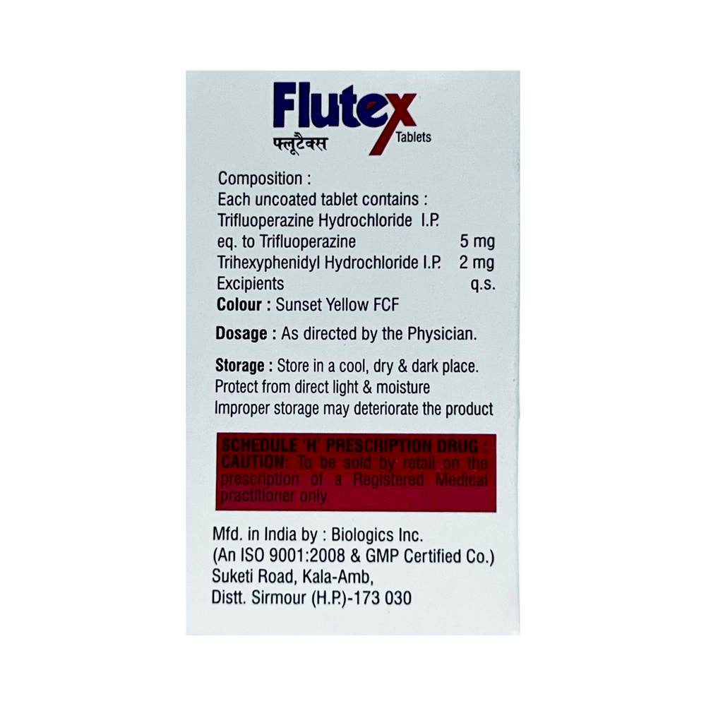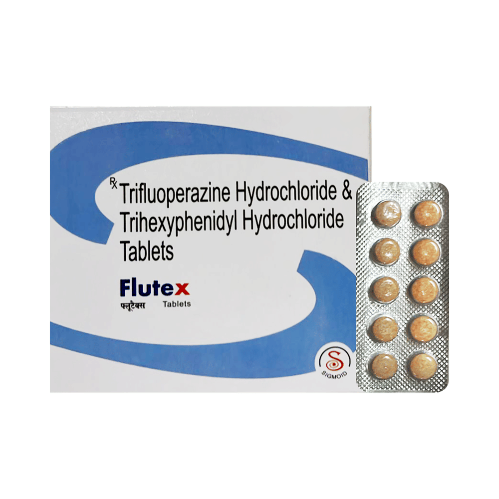 Flutex Tablet is a combination of two medicines: Trifluoperazine and Trihexyphenidyl. Trifluoperazine is a typical antipsychotic. It works by blocking the action of a chemical messenger (dopamine) in the brain that affects thoughts and mood. However, it may cause side effects such as involuntary movements (shaking of hands, muscle spasms). Trihexyphenidyl is added to treat and prevent these side effects.