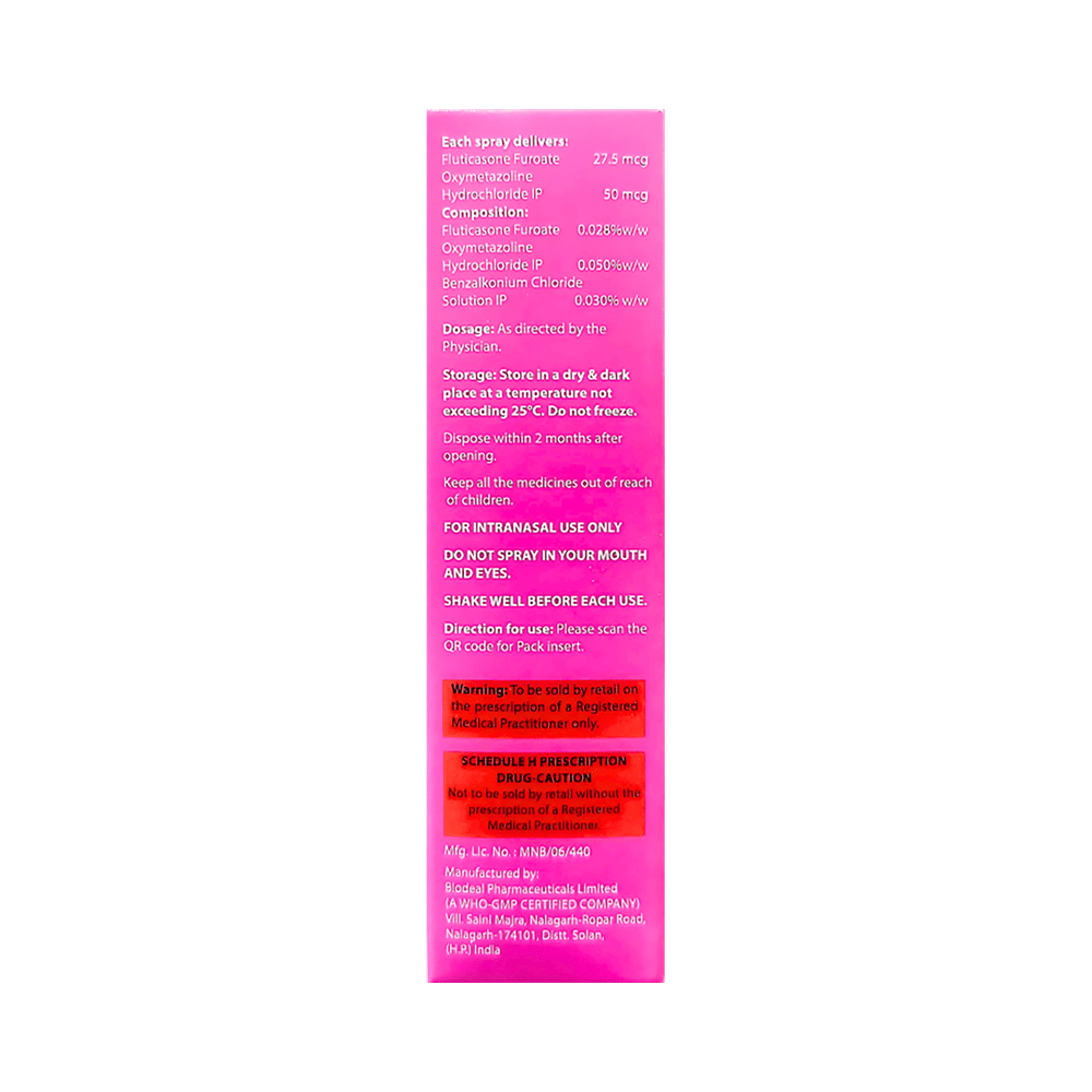 In Treatment of Sneezing and runny nose due to allergiesFluticatone Oxy Nasal Spray provides relief from symptoms such as blocked or runny nose, sneezing, and itchy or watery eyes. This will make it easier for you to go about your daily activities. It rarely has any serious side effects and you may only need to take it on days you have symptoms. Moreover, Fluticatone Oxy Nasal Spray makes you feel less sleepy as compared to other antihistamine medicines. If you are taking it to prevent symptoms, use it regularly to get the most benefits.