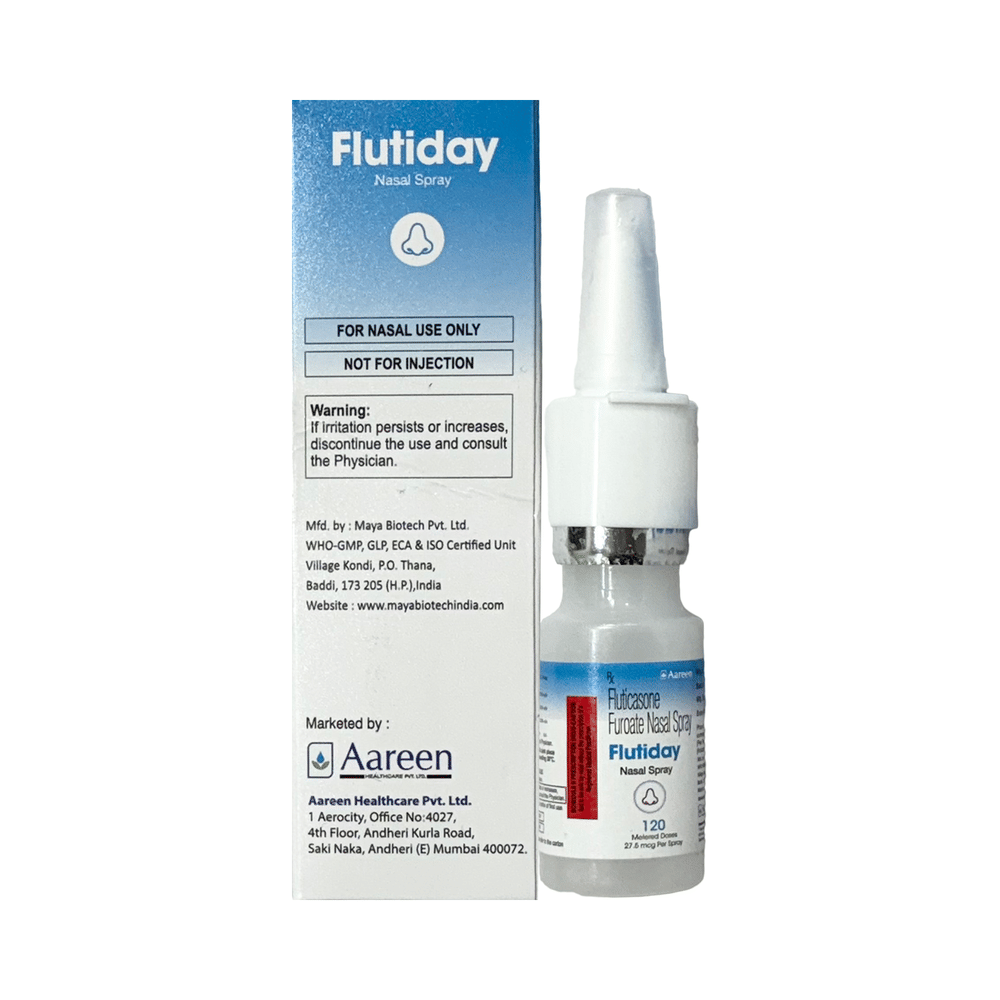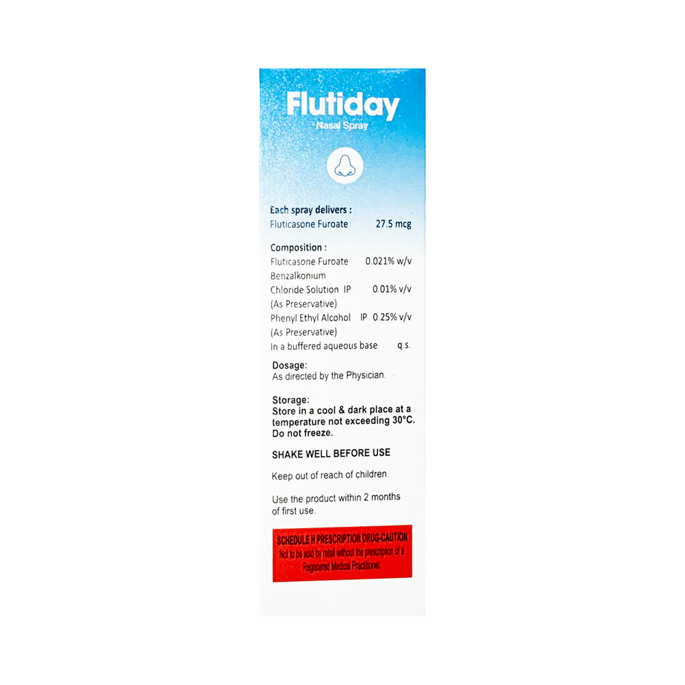 Flutiday Nasal Spray is a steroid. It relieves the symptoms of allergic rhinitis such as runny nose, sneezing and sinus discomfort. It works by blocking the production of certain chemical messengers that cause inflammation (swelling) and allergies, thus relieving the discomfort and irritation in your nose. You should always use it as advised by your doctor but to get the full benefit you should take it regularly. It may take a few days for the spray to take full effect. If you do not see an improvement in your symptoms after a week you should talk to your doctor.The most common side effects of Flutiday Nasal Spray include nasal discomforts such as burning or itching. It can also cause nosebleeds, nasal inflammation, and headaches in some patients. Talk to your doctor if you are worried about side effects or they do not go away. This medicine may lower the ability of your body to fight off infections, so try to stay away from someone having chickenpox, measles, or tuberculosis. In general, you should try to avoid situations which make your symptoms worse (things like pollen and dust mites), and it would be best to avoid smoking.Before starting to use this medicine you should let your doctor know if you are pregnant or breastfeeding, discuss the risks and benefits with your healthcare team. If you use this medicine for a long time, your doctor may want to carry out certain medical tests during the duration of treatment to check your progress.