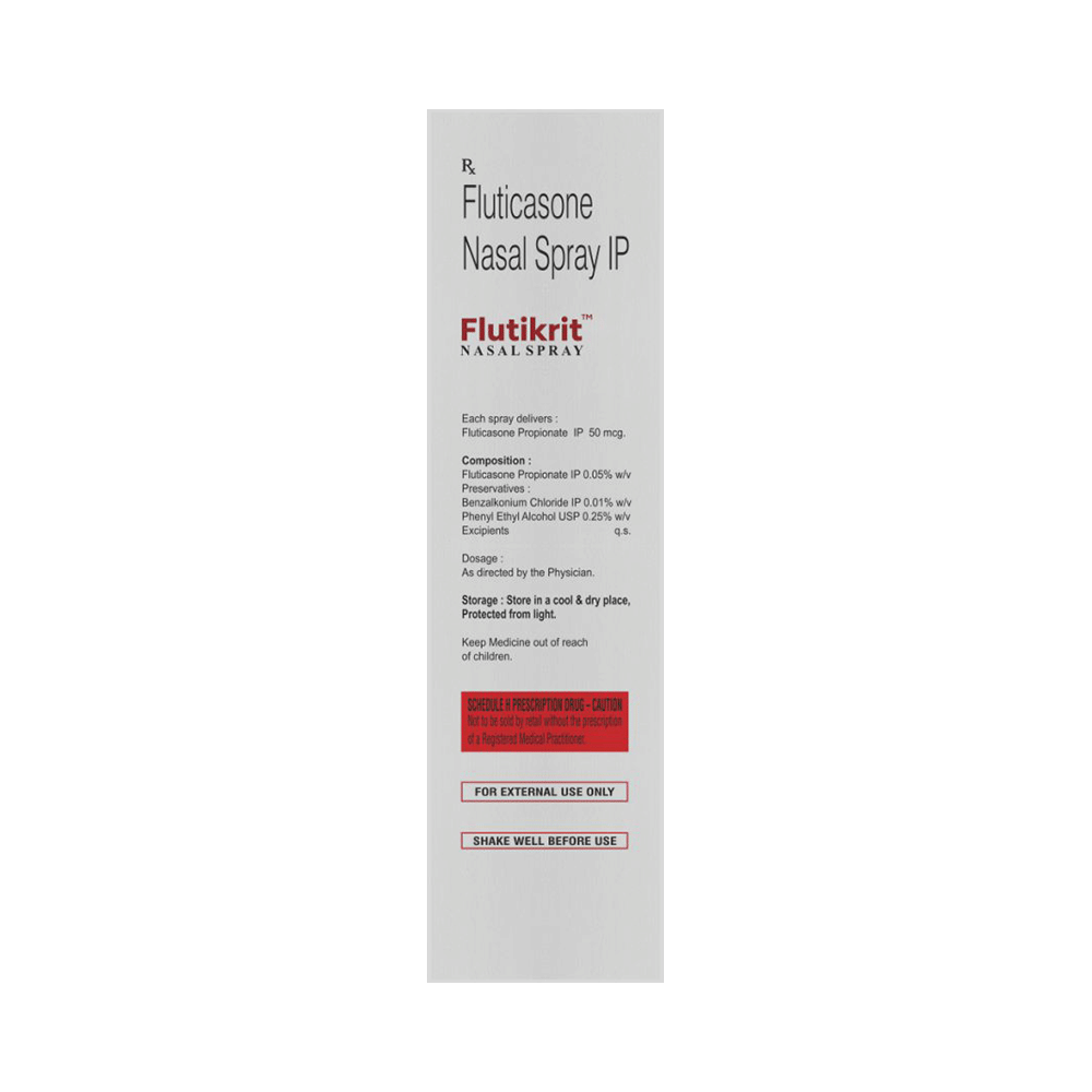 Flutikrit Nasal Spray is a steroid. It relieves the symptoms of allergic rhinitis such as runny nose, sneezing and sinus discomfort. It works by blocking the production of certain chemical messengers that cause inflammation (swelling) and allergies, thus relieving the discomfort and irritation in your nose. You should always use it as advised by your doctor but to get the full benefit you should take it regularly. It may take a few days for the spray to take full effect. If you do not see an improvement in your symptoms after a week you should talk to your doctor.The most common side effects of Flutikrit Nasal Spray include nasal discomforts such as burning or itching. It can also cause nosebleeds, nasal inflammation, and headaches in some patients. Talk to your doctor if you are worried about side effects or they do not go away. This medicine may lower the ability of your body to fight off infections, so try to stay away from someone having chickenpox, measles, or tuberculosis. In general, you should try to avoid situations which make your symptoms worse (things like pollen and dust mites), and it would be best to avoid smoking.Before starting to use this medicine you should let your doctor know if you are pregnant or breastfeeding, discuss the risks and benefits with your healthcare team. If you use this medicine for a long time, your doctor may want to carry out certain medical tests during the duration of treatment to check your progress.