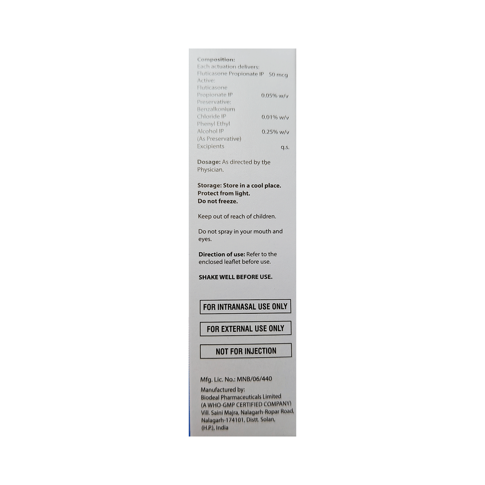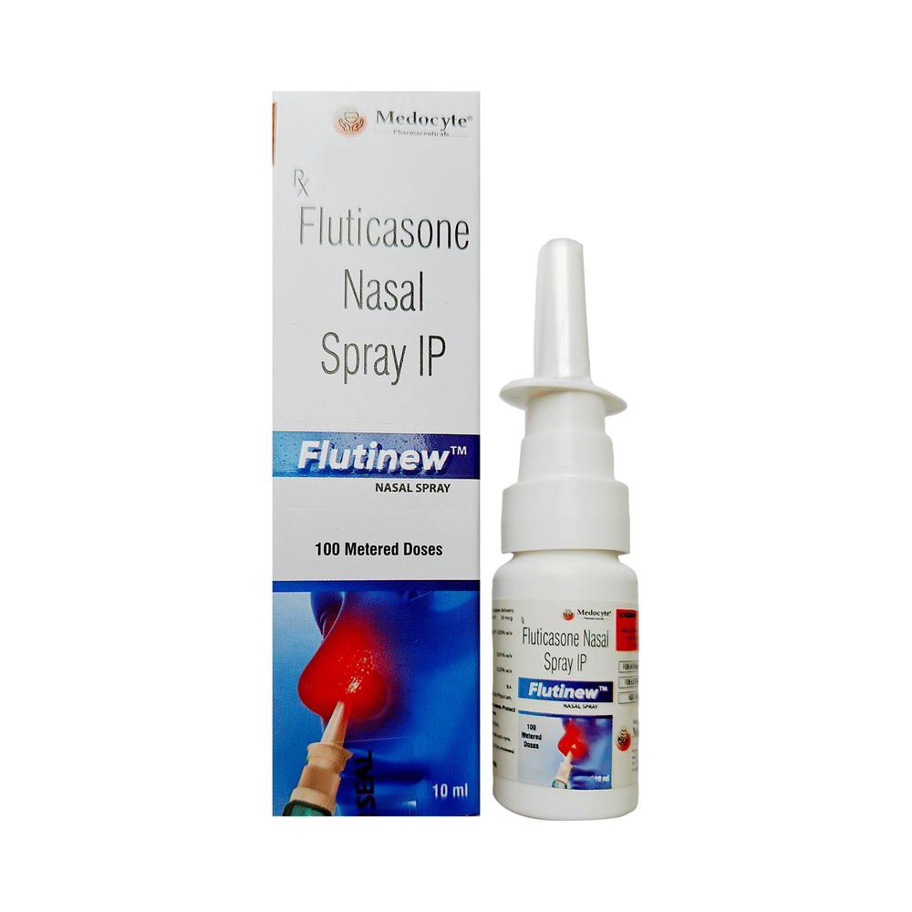 Flutinew Nasal Spray is a steroid. It relieves the symptoms of allergic rhinitis such as runny nose, sneezing and sinus discomfort. It works by blocking the production of certain chemical messengers that cause inflammation (swelling) and allergies, thus relieving the discomfort and irritation in your nose. You should always use it as advised by your doctor but to get the full benefit you should take it regularly. It may take a few days for the spray to take full effect. If you do not see an improvement in your symptoms after a week you should talk to your doctor.The most common side effects of Flutinew Nasal Spray include nasal discomforts such as burning or itching. It can also cause nosebleeds, nasal inflammation, and headaches in some patients. Talk to your doctor if you are worried about side effects or they do not go away. This medicine may lower the ability of your body to fight off infections, so try to stay away from someone having chickenpox, measles, or tuberculosis. In general, you should try to avoid situations which make your symptoms worse (things like pollen and dust mites), and it would be best to avoid smoking.Before starting to use this medicine you should let your doctor know if you are pregnant or breastfeeding, discuss the risks and benefits with your healthcare team. If you use this medicine for a long time, your doctor may want to carry out certain medical tests during the duration of treatment to check your progress.
