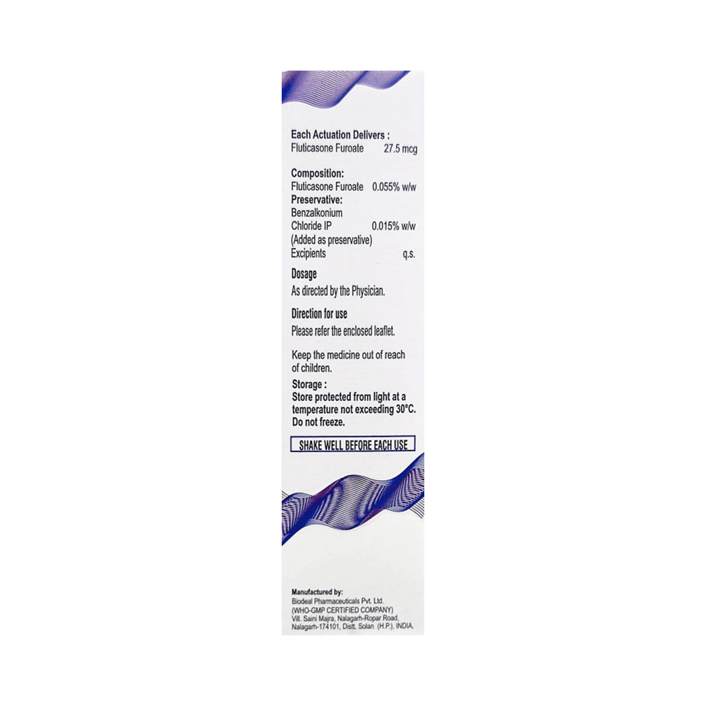 Flutiprl Nasal Spray is a steroid. It relieves the symptoms of allergic rhinitis such as runny nose, sneezing and sinus discomfort. It works by blocking the production of certain chemical messengers that cause inflammation (swelling) and allergies, thus relieving the discomfort and irritation in your nose. You should always use it as advised by your doctor but to get the full benefit you should take it regularly. It may take a few days for the spray to take full effect. If you do not see an improvement in your symptoms after a week you should talk to your doctor.The most common side effects of Flutiprl Nasal Spray include nasal discomforts such as burning or itching. It can also cause nosebleeds, nasal inflammation, and headaches in some patients. Talk to your doctor if you are worried about side effects or they do not go away. This medicine may lower the ability of your body to fight off infections, so try to stay away from someone having chickenpox, measles, or tuberculosis. In general, you should try to avoid situations which make your symptoms worse (things like pollen and dust mites), and it would be best to avoid smoking.Before starting to use this medicine you should let your doctor know if you are pregnant or breastfeeding, discuss the risks and benefits with your healthcare team. If you use this medicine for a long time, your doctor may want to carry out certain medical tests during the duration of treatment to check your progress.