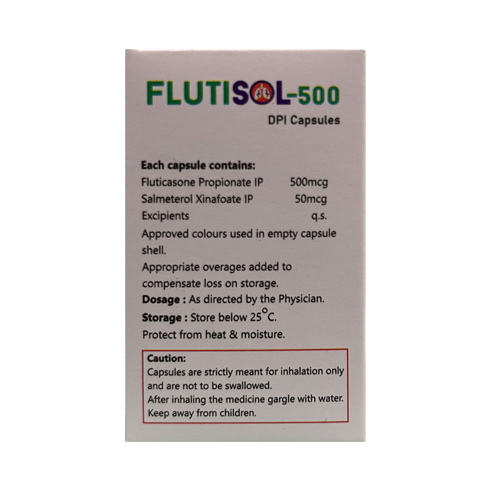 Flutisol 500 DPI Capsule is a combination of two medicines that opens the airways and makes it easier to breathe. It is used in the treatment of asthma (wheezing and shortness of breath) and chronic obstructive pulmonary disorder (a lung disorder in which the flow of air to the lungs is blocked). Your doctor will tell you how often you need to use your inhaler. The effect of this medicine may be noticeable after a few days but will only reach its maximum after a few weeks. This medicine must be used regularly to be effective, so go on taking it even if you don't have any symptoms. That means it’s doing its job. If you stop taking it your asthma and chronic obstructive pulmonary disorder (COPD) may get worse. It should not be used to relieve sudden asthma attacks. If an asthma attack occurs, use your quick-relief inhaler (reliever). To get the benefit from this medicine you need to make sure you get your inhaler technique right, otherwise, it does not work as well.The most common side effects are nausea, vomiting, respiratory tract infection, fungal infections in the mouth, headache, hoarseness of voice, sore throat, cough, musculoskeletal (bone, muscle, or joint) pain, and increased heart rate. If you get there, do not stop taking it but do talk to your doctor. You can help prevent some of these symptoms by rinsing your mouth and throat with water or brushing your teeth after using your inhaler. There are other, rarer side effects that can be serious. Talk to your doctor if you're worried about them. In general, you should be trying to avoid situations that make your asthma worse (your triggers) and try not to smoke.Ask your doctor whether it’s safe to take this medicine if you're pregnant or breastfeeding. Before taking it, you should tell your doctor if you have any kidney or liver diseases so that your doctor can prescribe a suitable dose for you.
