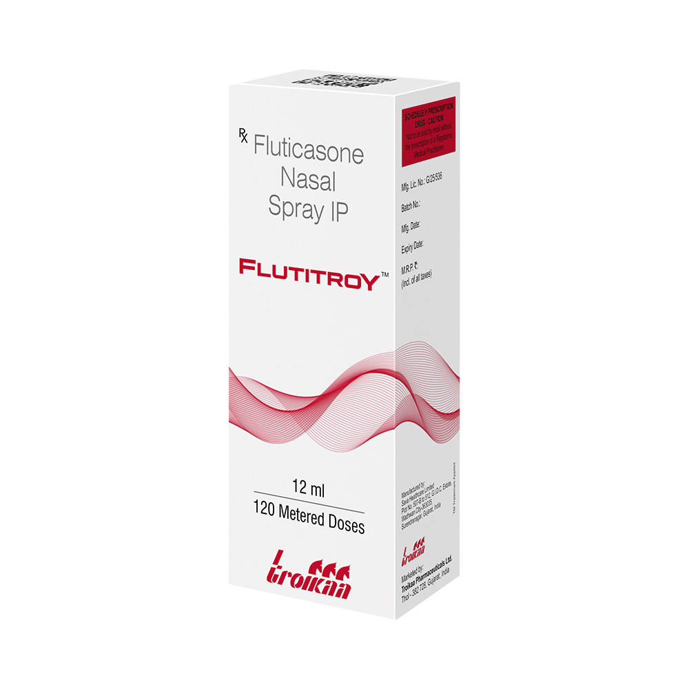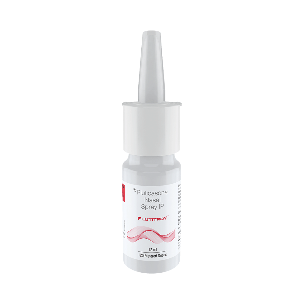 Flutitroy Nasal Spray is a steroid. It relieves the symptoms of allergic rhinitis such as runny nose, sneezing and sinus discomfort. It works by blocking the production of certain chemical messengers that cause inflammation (swelling) and allergies, thus relieving the discomfort and irritation in your nose. You should always use it as advised by your doctor but to get the full benefit you should take it regularly. It may take a few days for the spray to take full effect. If you do not see an improvement in your symptoms after a week you should talk to your doctor.The most common side effects of Flutitroy Nasal Spray include nasal discomforts such as burning or itching. It can also cause nosebleeds, nasal inflammation, and headaches in some patients. Talk to your doctor if you are worried about side effects or they do not go away. This medicine may lower the ability of your body to fight off infections, so try to stay away from someone having chickenpox, measles, or tuberculosis. In general, you should try to avoid situations which make your symptoms worse (things like pollen and dust mites), and it would be best to avoid smoking.Before starting to use this medicine you should let your doctor know if you are pregnant or breastfeeding, discuss the risks and benefits with your healthcare team. If you use this medicine for a long time, your doctor may want to carry out certain medical tests during the duration of treatment to check your progress.