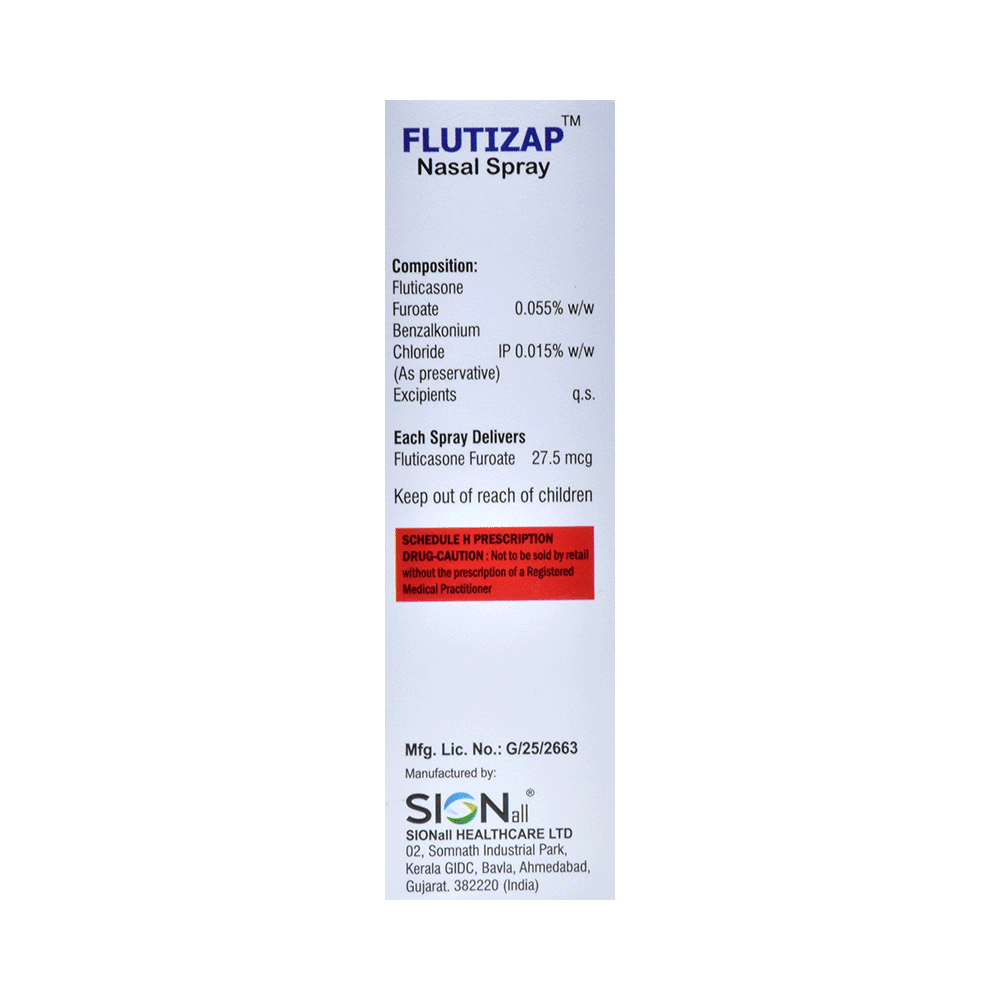 Flutizap Nasal Spray is a steroid. It relieves the symptoms of allergic rhinitis such as runny nose, sneezing and sinus discomfort. It works by blocking the production of certain chemical messengers that cause inflammation (swelling) and allergies, thus relieving the discomfort and irritation in your nose. You should always use it as advised by your doctor but to get the full benefit you should take it regularly. It may take a few days for the spray to take full effect. If you do not see an improvement in your symptoms after a week you should talk to your doctor.The most common side effects of Flutizap Nasal Spray include nasal discomforts such as burning or itching. It can also cause nosebleeds, nasal inflammation, and headaches in some patients. Talk to your doctor if you are worried about side effects or they do not go away. This medicine may lower the ability of your body to fight off infections, so try to stay away from someone having chickenpox, measles, or tuberculosis. In general, you should try to avoid situations which make your symptoms worse (things like pollen and dust mites), and it would be best to avoid smoking.Before starting to use this medicine you should let your doctor know if you are pregnant or breastfeeding, discuss the risks and benefits with your healthcare team. If you use this medicine for a long time, your doctor may want to carry out certain medical tests during the duration of treatment to check your progress.