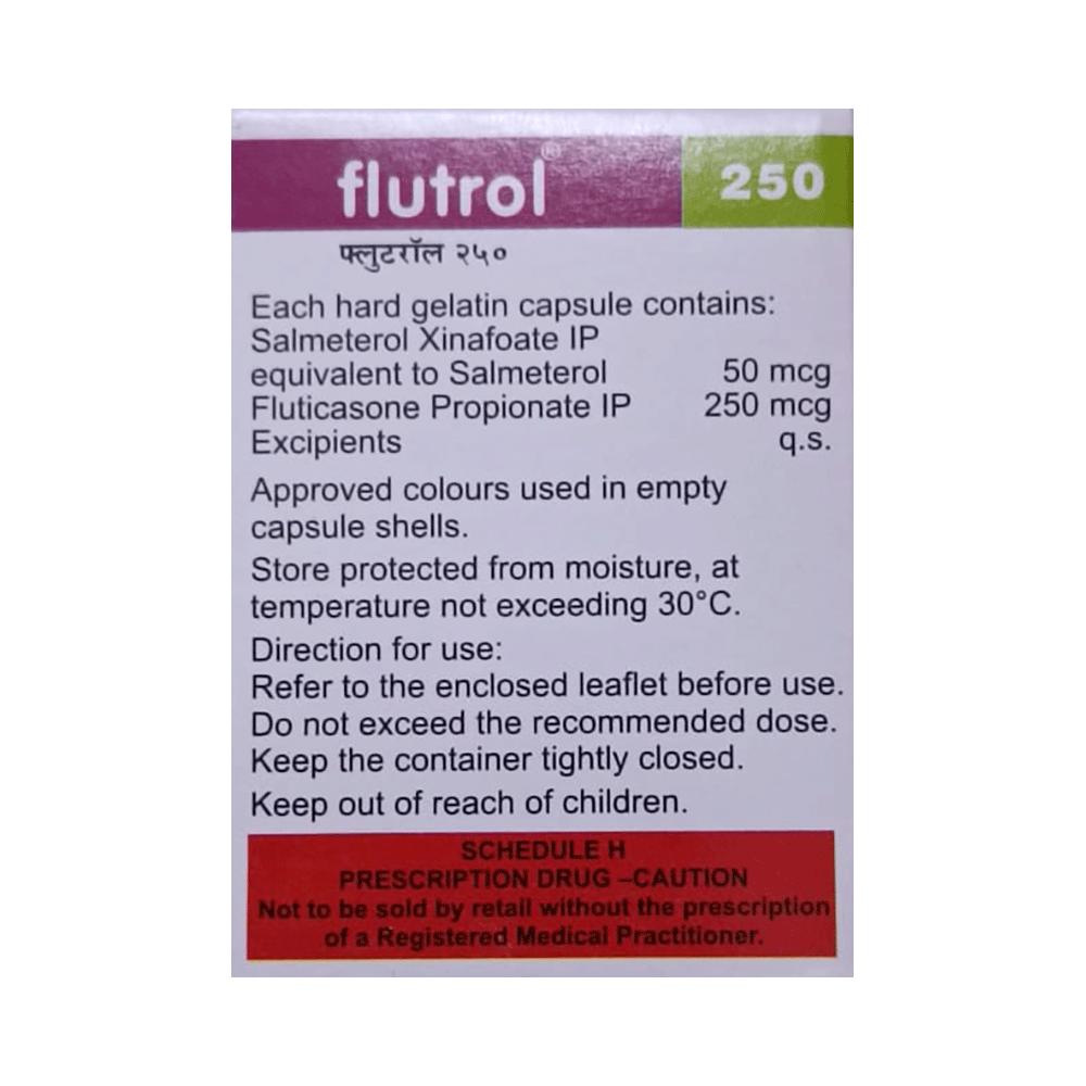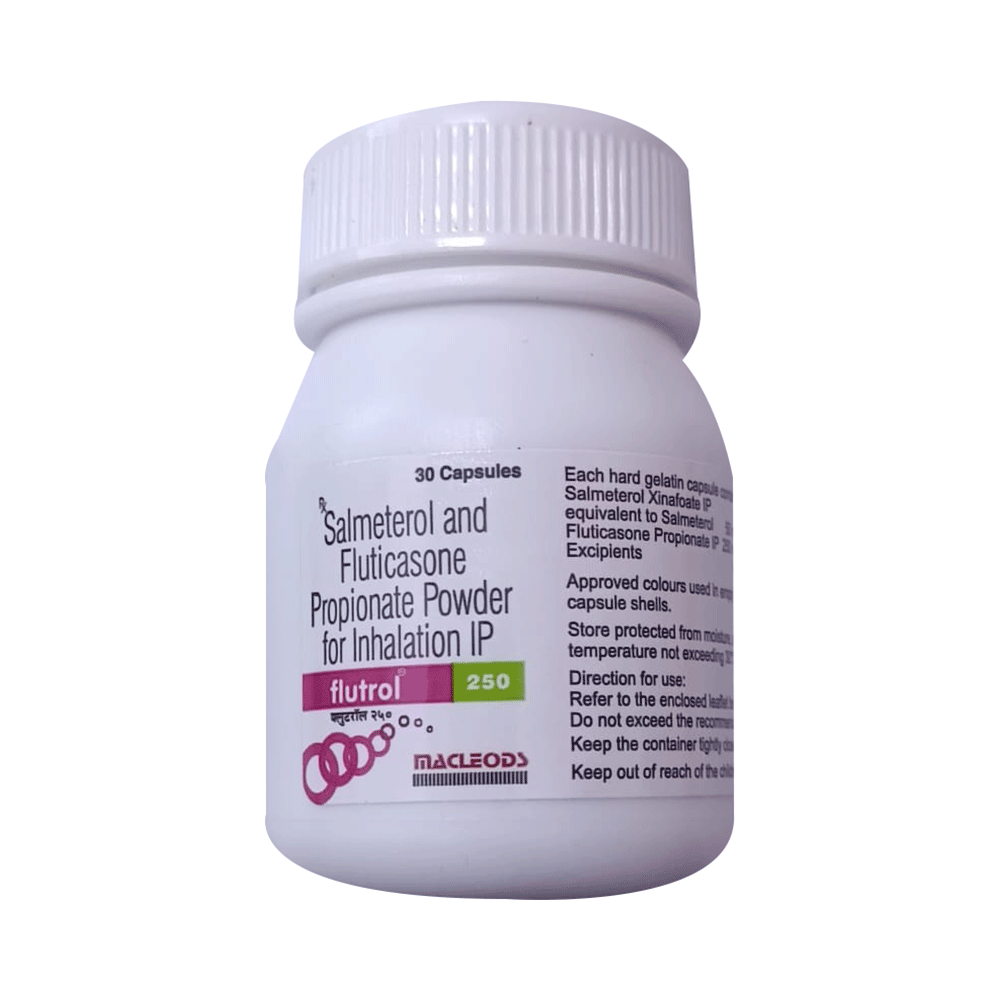 Flutrol 250 Capsule is a combination of two medicines that opens the airways and makes it easier to breathe. It is used in the treatment of asthma (wheezing and shortness of breath) and chronic obstructive pulmonary disorder (a lung disorder in which the flow of air to the lungs is blocked). Your doctor will tell you how often you need to use your inhaler. The effect of this medicine may be noticeable after a few days but will only reach its maximum after a few weeks. This medicine must be used regularly to be effective, so go on taking it even if you don't have any symptoms. That means it’s doing its job. If you stop taking it your asthma and chronic obstructive pulmonary disorder (COPD) may get worse. It should not be used to relieve sudden asthma attacks. If an asthma attack occurs, use your quick-relief inhaler (reliever). To get the benefit from this medicine you need to make sure you get your inhaler technique right, otherwise, it does not work as well.The most common side effects are nausea, vomiting, respiratory tract infection, fungal infections in the mouth, headache, hoarseness of voice, sore throat, cough, musculoskeletal (bone, muscle, or joint) pain, and increased heart rate. If you get there, do not stop taking it but do talk to your doctor. You can help prevent some of these symptoms by rinsing your mouth and throat with water or brushing your teeth after using your inhaler. There are other, rarer side effects that can be serious. Talk to your doctor if you're worried about them. In general, you should be trying to avoid situations that make your asthma worse (your triggers) and try not to smoke.Ask your doctor whether it’s safe to take this medicine if you're pregnant or breastfeeding. Before taking it, you should tell your doctor if you have any kidney or liver diseases so that your doctor can prescribe a suitable dose for you.