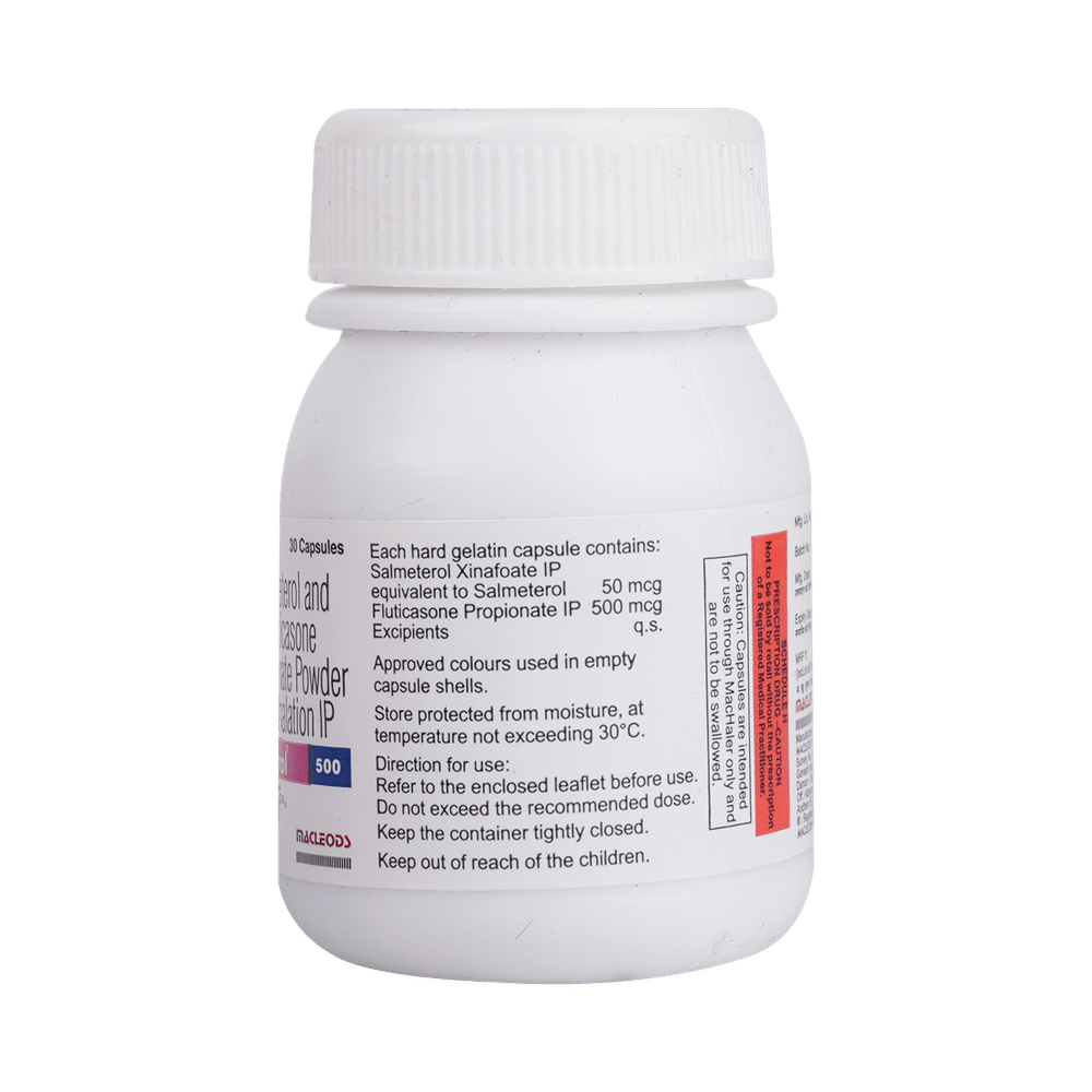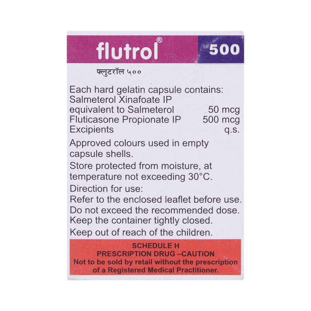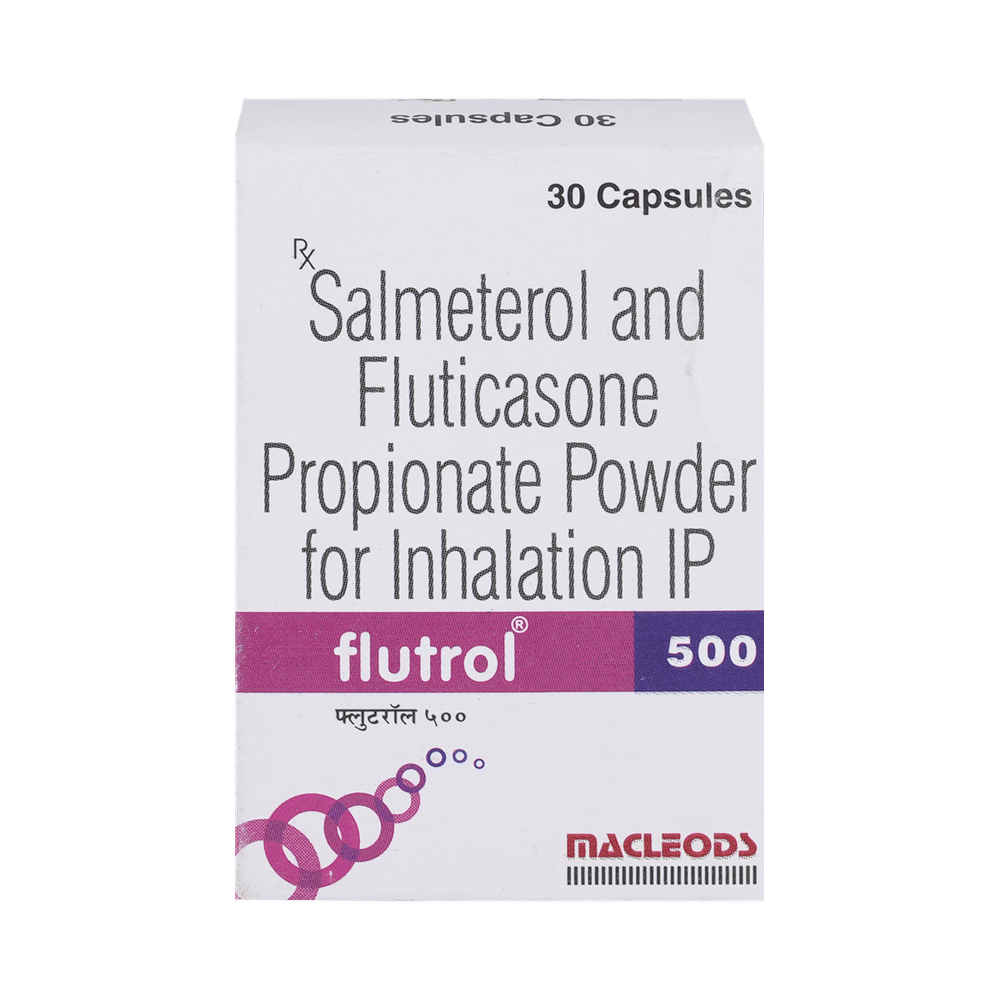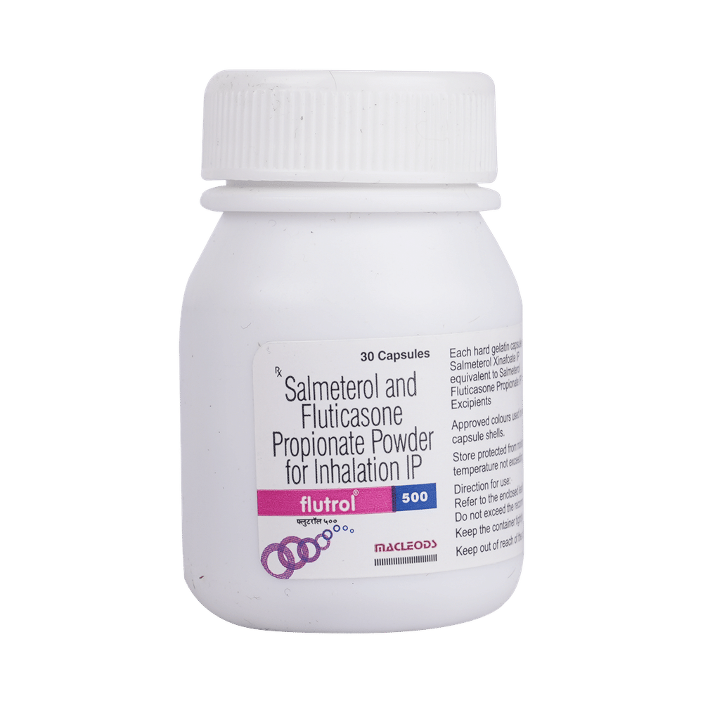 Flutrol 500 Capsule is a combination of two medicines that opens the airways and makes it easier to breathe. It is used in the treatment of asthma (wheezing and shortness of breath) and chronic obstructive pulmonary disorder (a lung disorder in which the flow of air to the lungs is blocked). Your doctor will tell you how often you need to use your inhaler. The effect of this medicine may be noticeable after a few days but will only reach its maximum after a few weeks. This medicine must be used regularly to be effective, so go on taking it even if you don't have any symptoms. That means it’s doing its job. If you stop taking it your asthma and chronic obstructive pulmonary disorder (COPD) may get worse. It should not be used to relieve sudden asthma attacks. If an asthma attack occurs, use your quick-relief inhaler (reliever). To get the benefit from this medicine you need to make sure you get your inhaler technique right, otherwise, it does not work as well.The most common side effects are nausea, vomiting, respiratory tract infection, fungal infections in the mouth, headache, hoarseness of voice, sore throat, cough, musculoskeletal (bone, muscle, or joint) pain, and increased heart rate. If you get there, do not stop taking it but do talk to your doctor. You can help prevent some of these symptoms by rinsing your mouth and throat with water or brushing your teeth after using your inhaler. There are other, rarer side effects that can be serious. Talk to your doctor if you're worried about them. In general, you should be trying to avoid situations that make your asthma worse (your triggers) and try not to smoke.Ask your doctor whether it’s safe to take this medicine if you're pregnant or breastfeeding. Before taking it, you should tell your doctor if you have any kidney or liver diseases so that your doctor can prescribe a suitable dose for you.