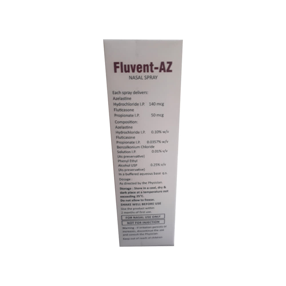 Fluvent-AZ Nasal Spray is a combination of two medicines: Fluticasone Propionate and Azelastine, which relieves sneezing and runny nose caused due to allergies (allergic rhinitis). Fluticasone Propionate is a steroid which works by blocking the release of certain chemical messengers that cause inflammation (swelling) and irritation in the nose. Azelastine is an antiallergic which relieves allergy symptoms like runny nose, watery eyes and sneezing.
