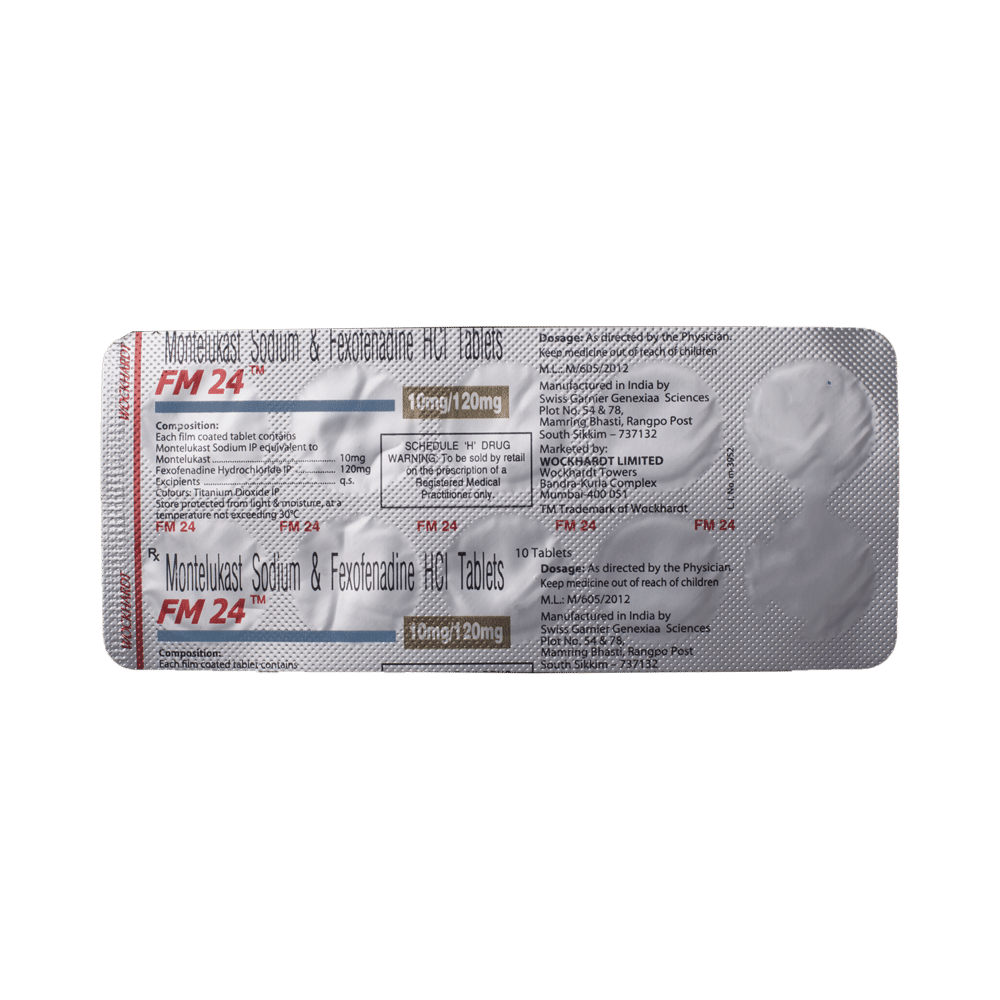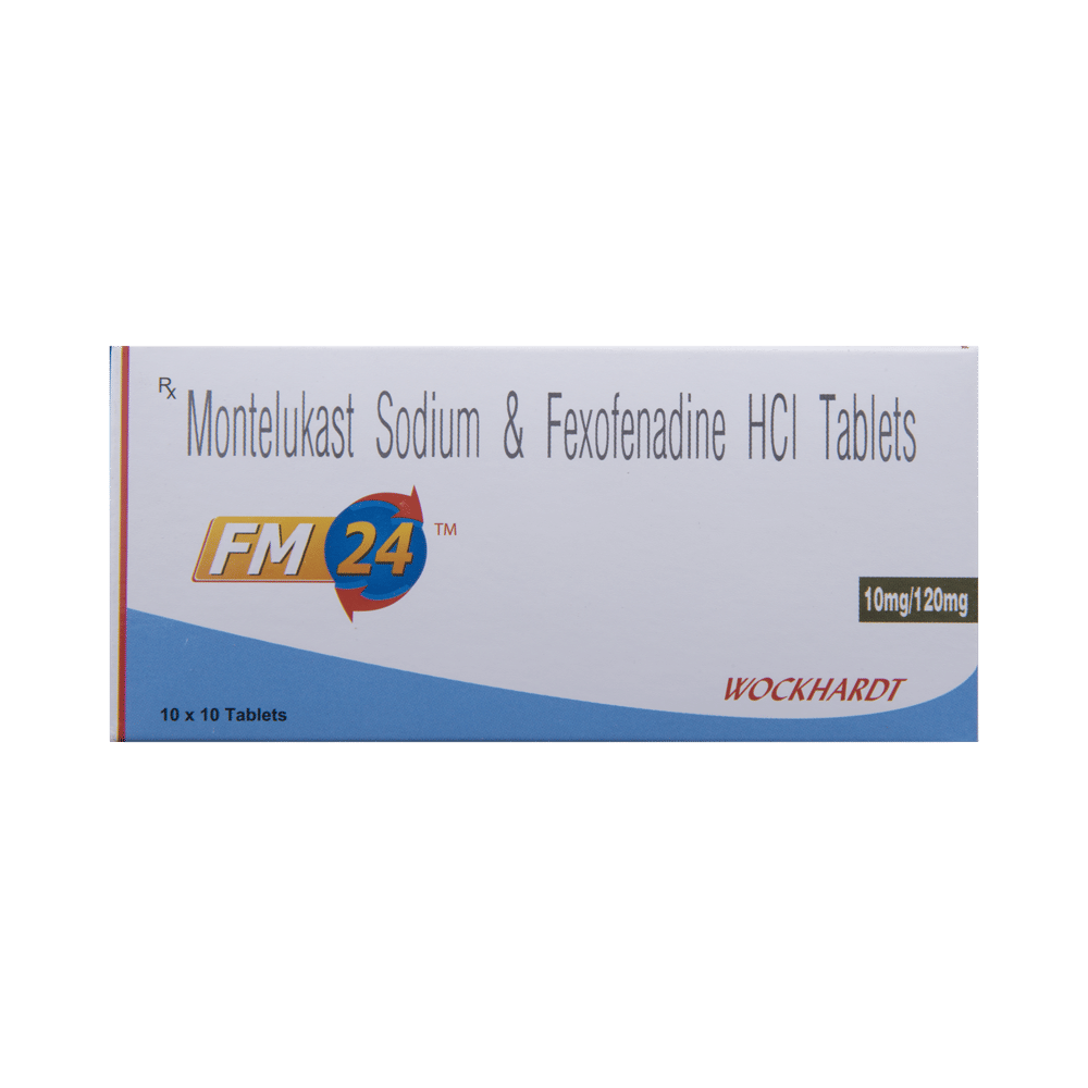 FM 24 Tablet is a combination medicine used in the treatment of allergy symptoms such as runny nose, stuffy nose, sneezing, watery eyes, and congestion or stuffiness. FM 24 Tablet is taken with or without food in a dose and duration as advised by the doctor. The dose you are given will depend on your condition and how you respond to the medicine. You should keep taking this medicine for as long as your doctor recommends. If you stop treatment too early your symptoms may come back and your condition may worsen. Let your healthcare team know about all other medications you are taking as some may affect, or be affected by this medicine.The most common side effects include nausea, diarrhea, vomiting, skin rash, flu-like symptoms, and headache. Most of these are temporary and usually resolve with time. Contact your doctor straight away if you are at all concerned about any of these side effects. This medicine may cause dizziness and sleepiness, so do not drive or do anything that requires mental focus until you know how this medicine affects you. Avoid drinking alcohol while taking this medicine as it can worsen your sleepiness.Never support self-medication or recommend your medicine to another person. It is beneficial to have plenty of fluids while taking this medication. Before you start taking this medicine it is important to inform your doctor if you are suffering from liver or kidney disease. You should also tell your doctor if you are pregnant, planning pregnancy or breastfeeding.