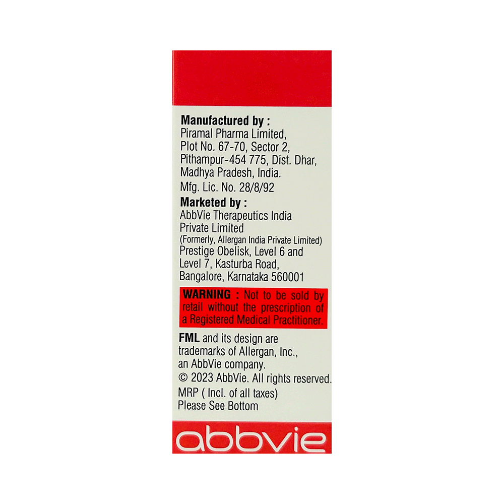 FML Liquifilm belongs to a group of medicines called steroids. It is used to treat redness and swelling in the eyes that may be due to infection or allergy. It reduces swelling, itching, and soreness after any eye injuries or eye surgery. FML Liquifilm should be used in the dose and duration as directed by your doctor. Never use it if the seal is broken before you use it for the first time. Wash your hands thoroughly before applying the medicine. Make sure you remove contact lenses if you wear them and wait for at least 15 minutes before putting them back. Continue using it regularly to get the most benefit from it.Common side effects include eye irritation and increased intraocular pressure. These side effects are usually temporary and resolve with time. If your vision is blurred or you have other changes in sight for a short time, do not drive or operate other machines until your vision is clear. If you are pregnant or breastfeeding, you should consult with your doctor before using this medicine.