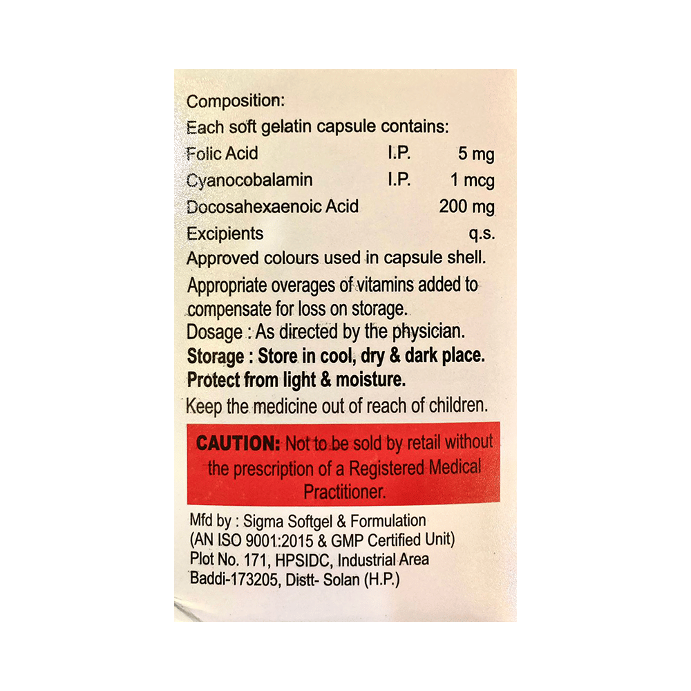 Salt Composition: Folic Acid (5mg) + Cyanocobalamin (1mcg) + Docosahexanoic acid(DHA) (200mg)