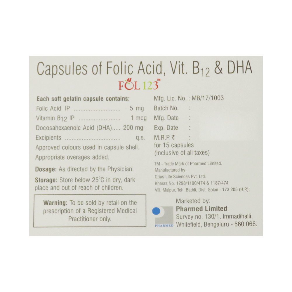Fol 123 Soft Gelatin Capsule is a combination of three medicines: folic acid, cyanocobalamin, and docosahexaenoic acid (DHA). Folic acid is a form of vitamin B. It plays a vital role in the formation of red blood cells, which carry oxygen throughout the body. Cyanocobalamin is a form of vitamin B12 that provides essential nutrients. Docosahexaenoic acid (DHA) belongs to the class of medications called nutritional supplements. DHA plays a vital role in brain development. DHA decreases cholesterol and triglyceride levels, inhibits platelet aggregation and oxidation of LDL, and decreases the synthesis of inflammatory markers such as prostaglandins. Overall, DHA plays a vital role in reducing heart and circulatory disease risks.