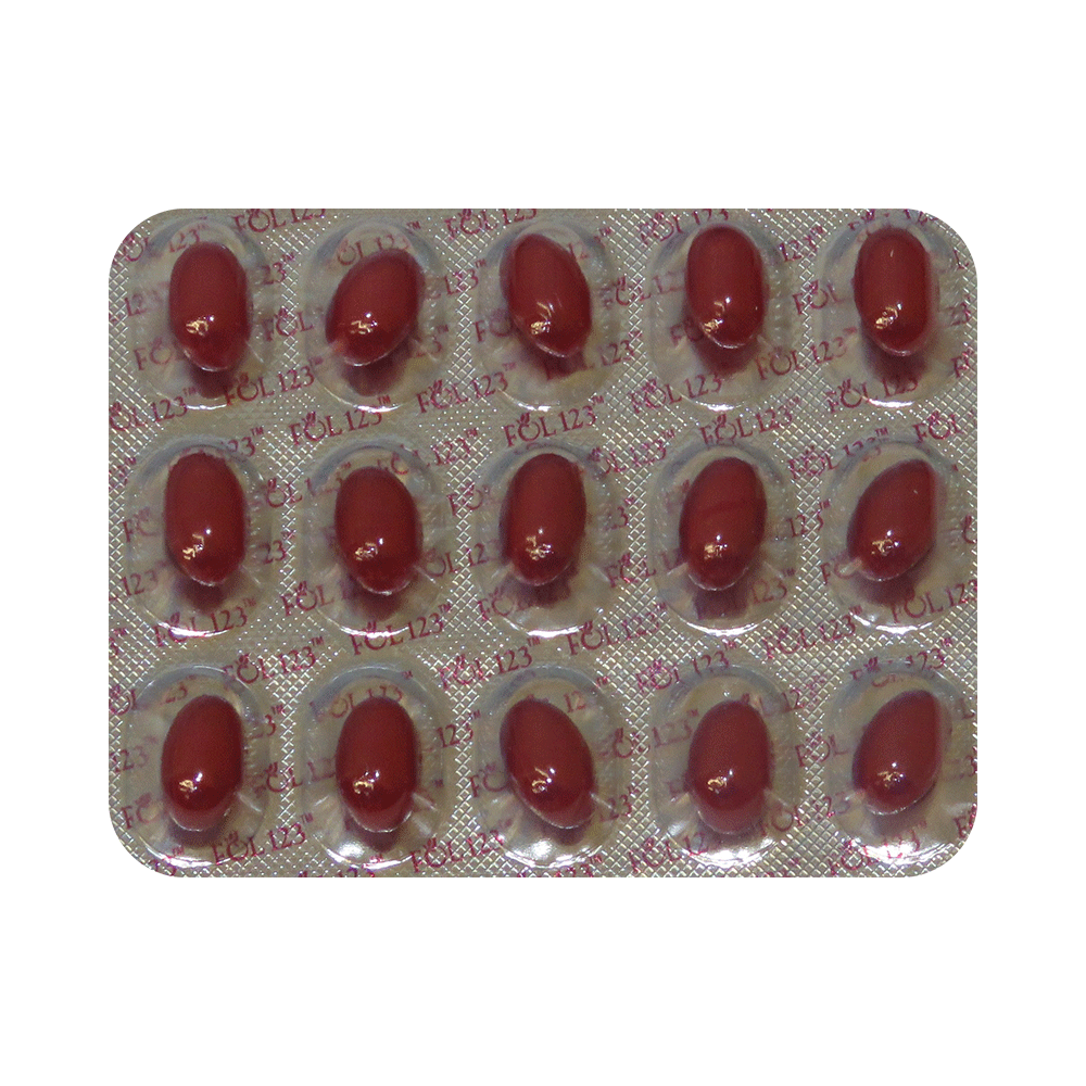 Fol 123 Soft Gelatin Capsule is a nutritional supplement. It is taken to treat conditions caused by a deficiency of vitamins, minerals, and other nutrients in the body. It ensures proper growth and improves the functioning of the body. It also plays a vital role in reducing heart and circulatory disease risks. Fol 123 Soft Gelatin Capsule may be taken with or without food. Take it in the dose and duration advised by the doctor. To get the most benefit, take it regularly at the same time each day and continue taking it until your prescription is finished. Do not take it for more than or longer than prescribed by the doctor, as that may cause harmful effects.Fol 123 Soft Gelatin Capsule is generally a safe medicine with little or no side effects. However, if you experience any symptoms that you think are caused by the medicine, let your doctor know. They may be able to suggest ways to reduce or prevent the side effects.To make sure it is safe for you, let your doctor know if you have any preexisting medical conditions or if you are taking any other medications before taking Fol 123 Soft Gelatin Capsule. Pregnant and breastfeeding women should consult their doctor before taking this medicine to make sure it is safe for them.