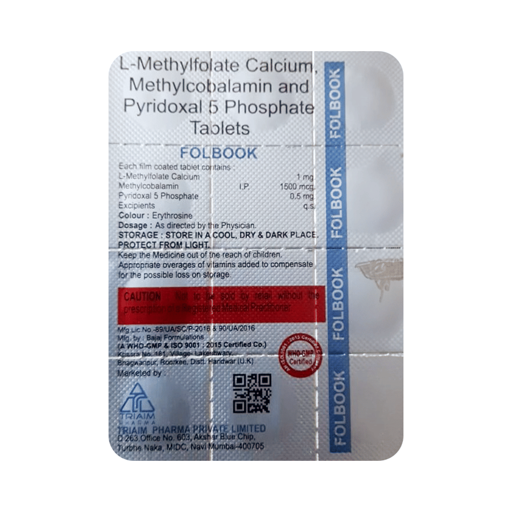 Folbook Tablet is a combination of three nutritional supplements. L-Methyl Folate is a form of folate that replenishes the folic acid deficiency, this in turn helps in the formation of new red blood cells to treat or prevent anemia. Methylcobalamin and Pyridoxal-5-phosphate are vitamins. They restore any vitamin deficiencies in the body. This helps in maintaining proper hormonal balance in the body to ensure appropriate growth and functioning of the organs.